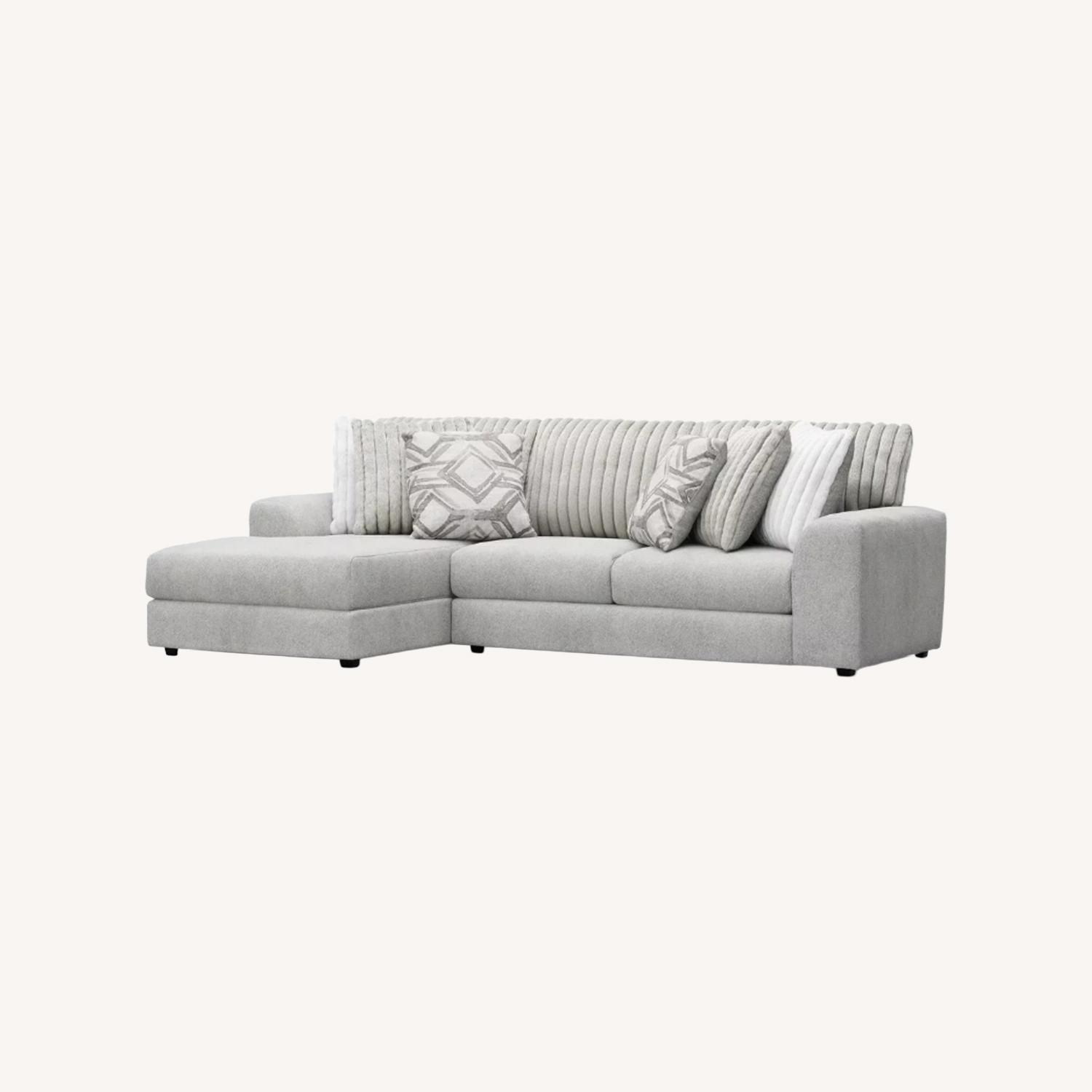 Seller's Notes:Transitional in style, this sectional features gray scatterback cushions with ultra soft fabric. Coordinating pillows are included. Excellent condition.