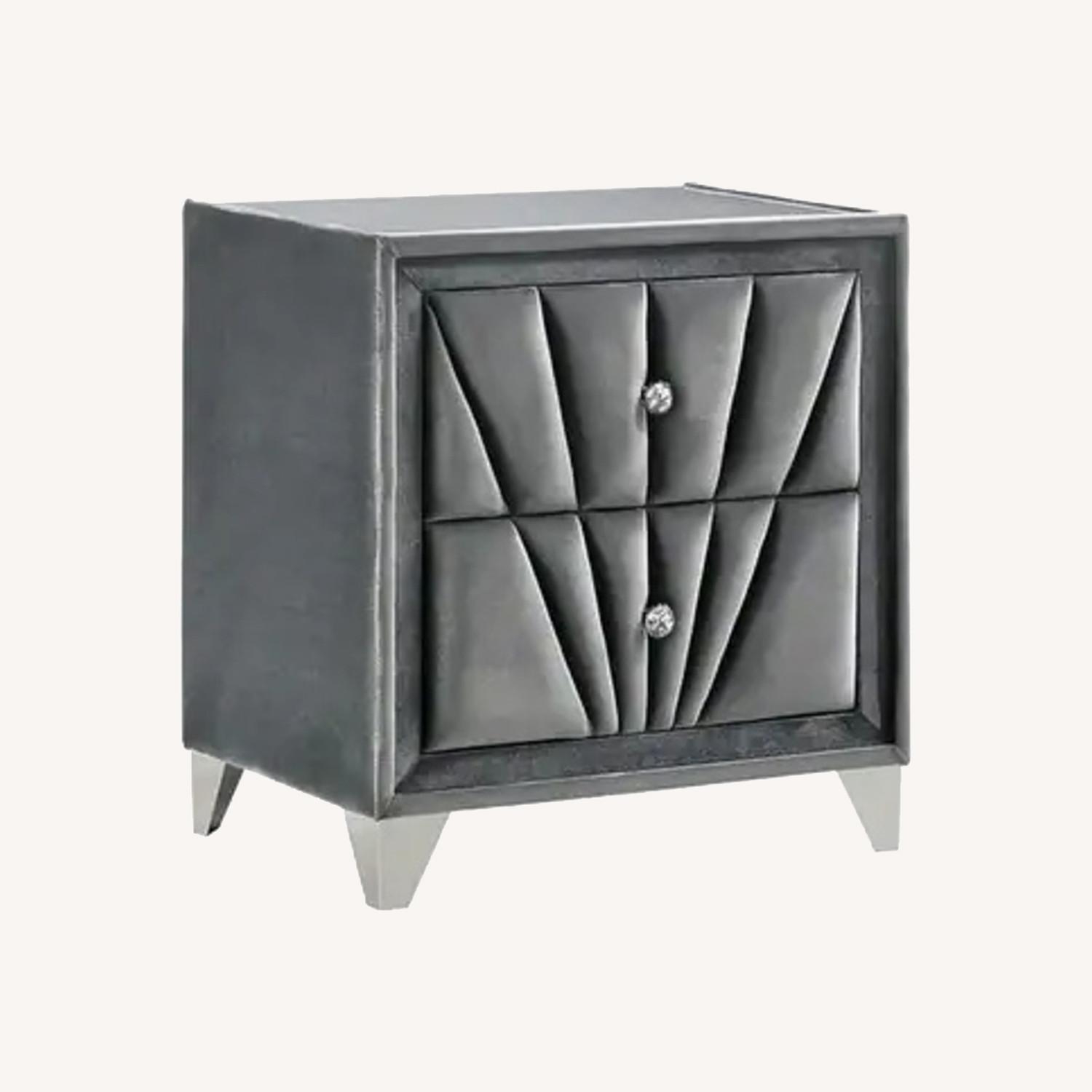 Seller's Notes:The ultimate art deco-inspired nightstand! The elegance, glamour, unique shapes, and vintage appeal are right here! The decadent gray velvet upholstery looks like it came right out of a classic old movie! Additional embellishments such as rhombus chrome feet and diamond ring drawer-pulls faithfully enhance the cinematic reality.