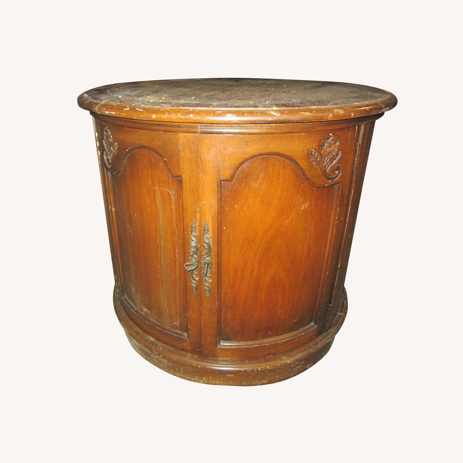 Seller's Notes:VTG 60'S OCCASIONAL TABLE, ROUND DRUM TABLE GREAT DIY PROJECT VTG 60'S WOOD DRUM TABLE OCCASIONAL TABLE W/FLORAL CARVED CORNERS BY DOORS, SOLID WOOD CONSTRUCTION, MEDIUM BROWN STAINED, R,832-21 ON BOTTOM, GREAT DIY PROJECT LOADS OF CHARACTER 22'' TALL 25'' ACROSS, DOORS 17'' TALL 10.5'' WIDE OFFERS WELCOME OBO FURNITURE 11-17-25 BARN PLEASE NOTE THIS IS A USED & OR VINTAGE ITEM. THEY ARE NOT ALWAYS PERFECT. HOWEVER, I TRY TO NOTE ANY ISSUES AND OVERALL CONDITION. THEY ARE AS FOUND CONDITION. ANY QUESTIONS ASK PRIOR TO PURCHASE AS IS NO REFUNDS OR RETURNS