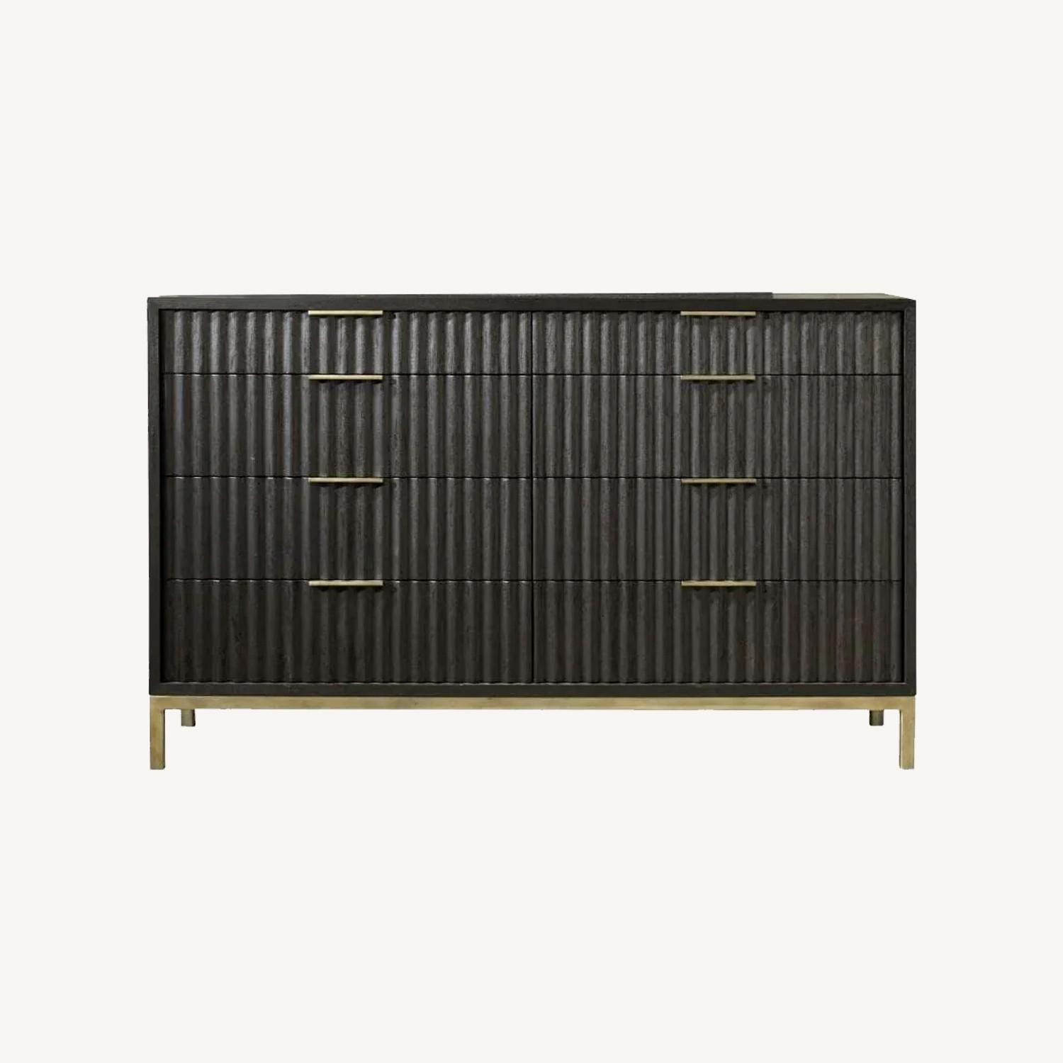 Featuring a wire brushed solid Mahogany wood in a Black Oak finish, the Kentfield collection is a nod to modern metropolitan design with its distinctive scalloped surface. Brushed brass top mount bar pulls and a tubular steel base complete the look.