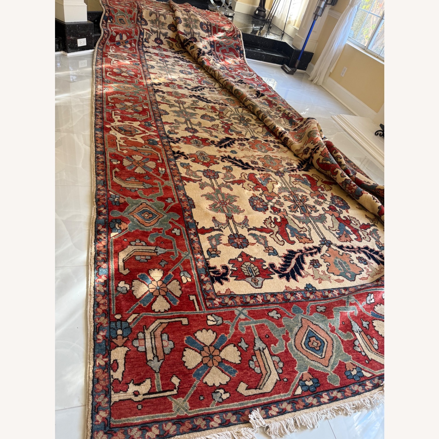 Seller's Notes:Exceptional oversized handwoven Persian Heriz rug, measuring approximately 6 × 4 meters (24 square meters). This is a substantial, room-defining piece featuring classic Heriz geometric motifs with rich red, ivory, and blue tones. Hand-knotted from 100% wool with a dense, durable pile. Strong construction and excellent craftsmanship, suitable for large living rooms, great rooms, estates, or formal spaces. A true statement rug. Well maintained and clean. Natural wear consistent with a handcrafted rug of this scale. No structural issues. Details: • Origin: Persia (Iran) • Type: Heriz • Material: 100% wool • Size: 6 × 4 meters (approx. 19.7 × 13.1 ft) • Area: ~24 m² • Condition: Very good Notes: Measurements are approximate. Handmade rugs may show natural variations.