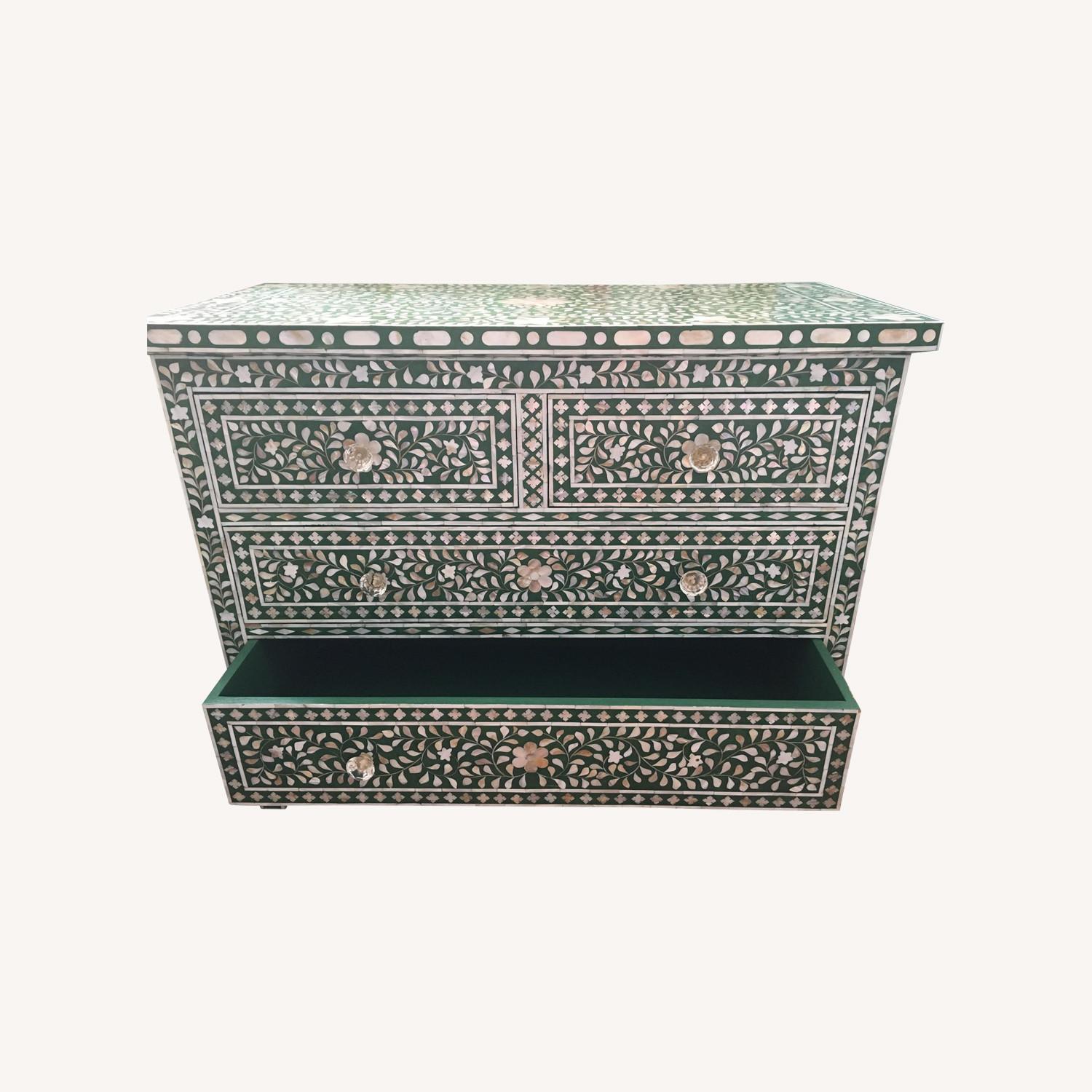 Seller's Notes:Description: Hand-carved in the ancient inlay tradition of India, this elegant chest with four drawers is made by local artisans using responsibly sourced camel-bone and mother-of-pearl. Its green color and one-of-a-kind variations make it a stunning piece for the home.