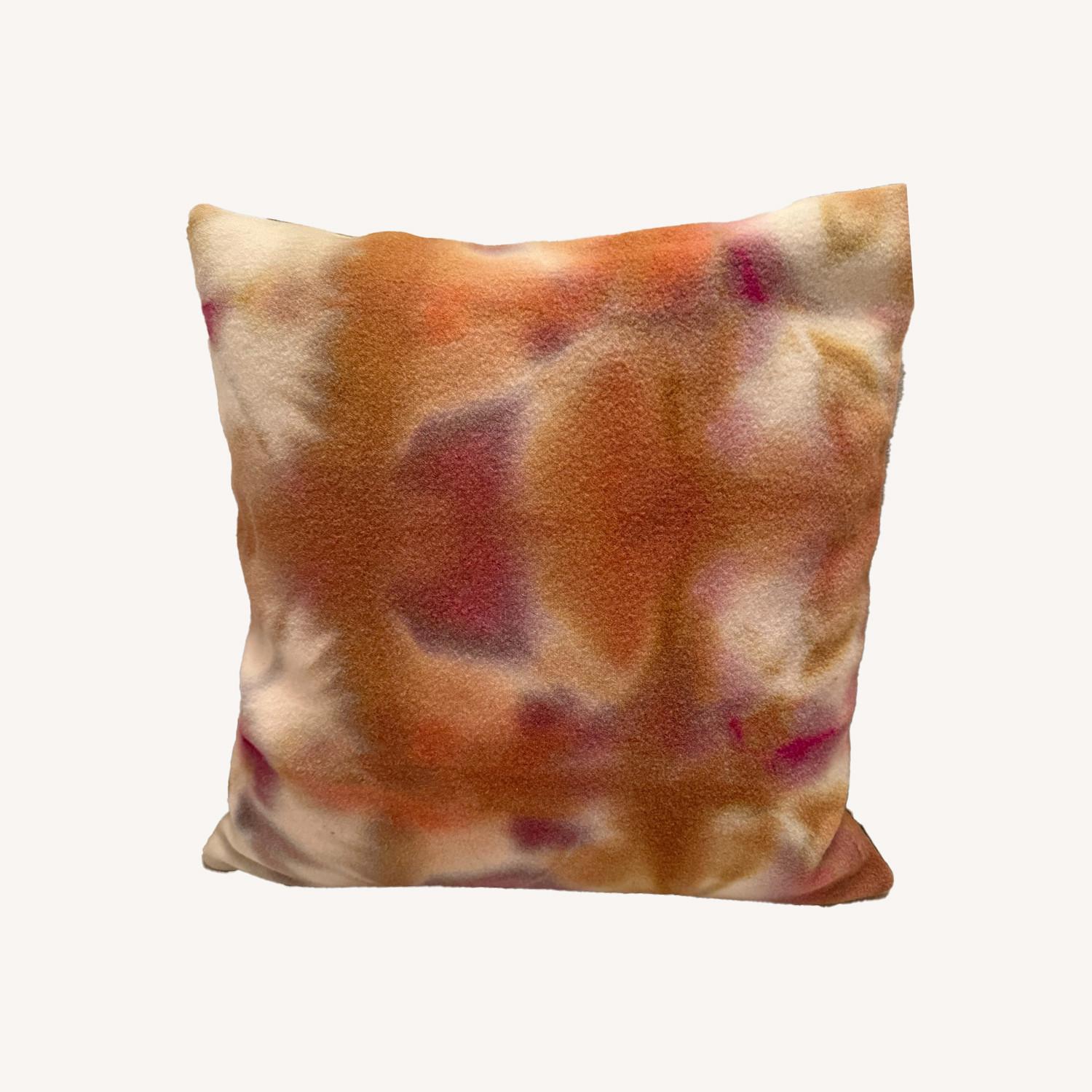 Seller's Notes:18" × 18" • Textured fabric Beautifully crafted reversible throw pillow from ABC Home, the iconic Manhattan design destination. One side features a rich watercolor tie-dye print in warm tones of pink, mauve, gold, and burgundy; the other reverses to a clean, solid olive green for a more understated look. Two pillows in one. In excellent condition with no pilling, staining, or wear. Originally $275 from ABC Home, 888 Broadway, New York. Insert included.