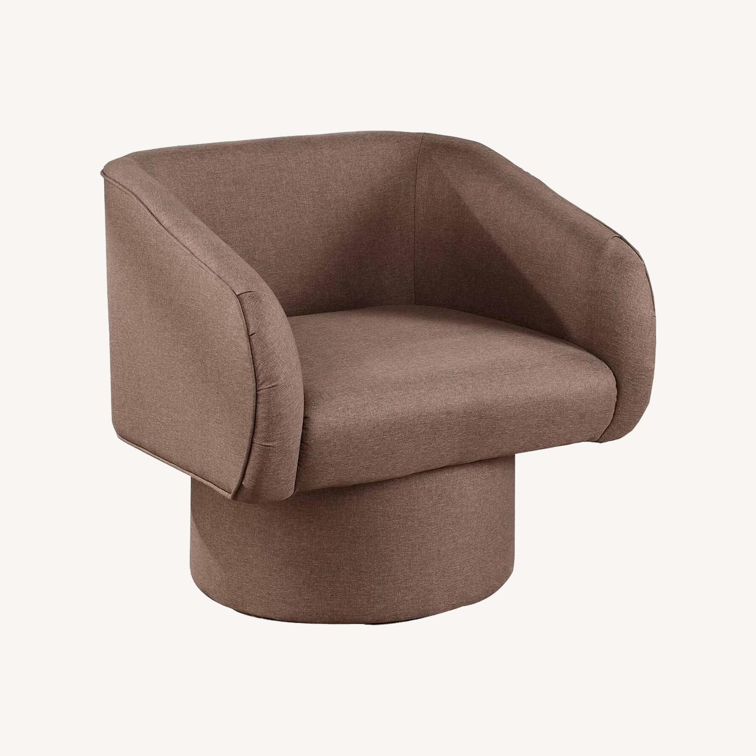 Seller's Notes:Condition: Excellent Quantity: Set of 2 Color: Deep dark brown Upholstered in a dark brown fabric. These chairs feature a curved barrel silhouette and a bold pedestal base that adds depth, warmth, and sophistication to any living space. Gently used and exceptionally maintained