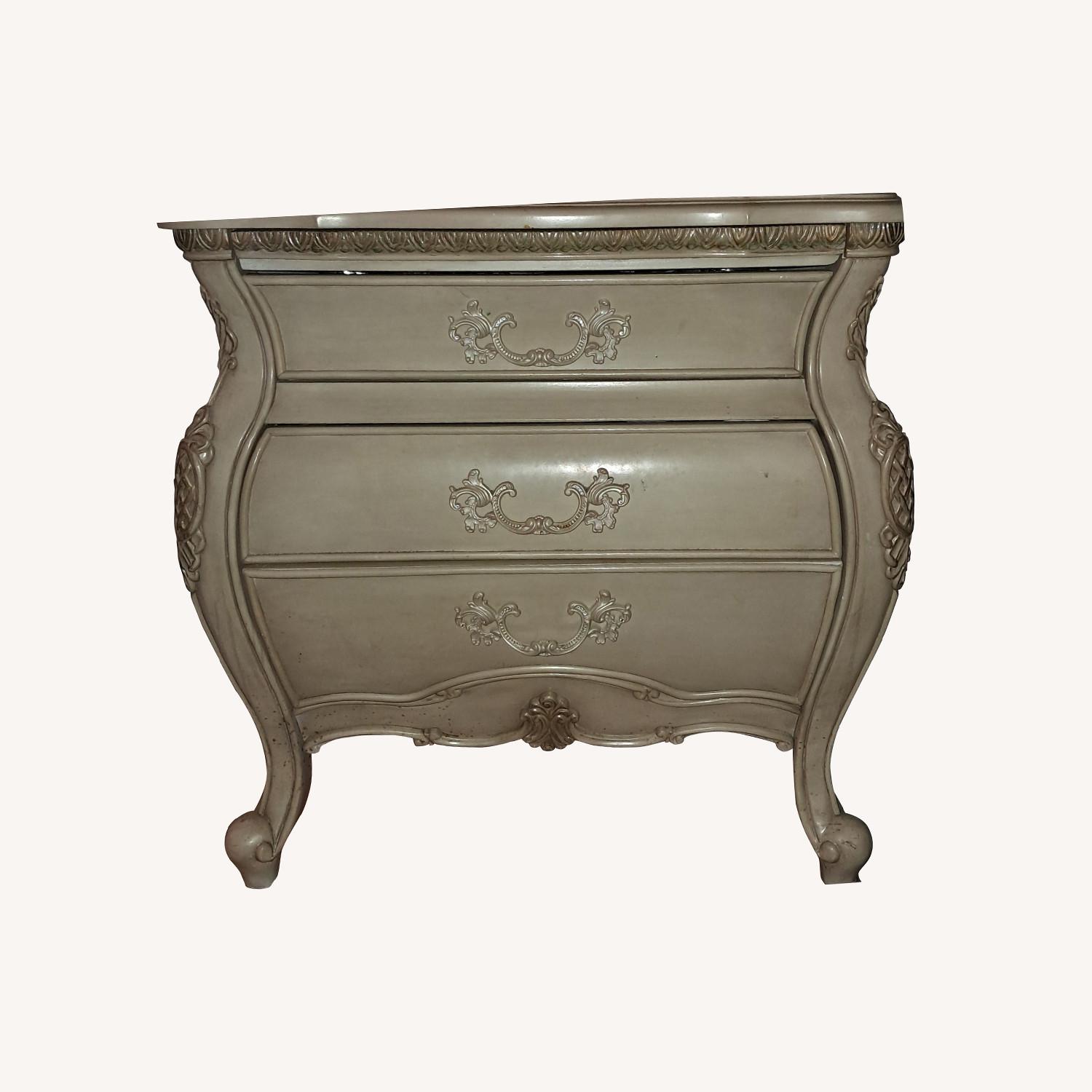Seller's Notes:Nightstand 3 velvet lined drawers english dovetail construction Velvet lined jewelry compartment in top drawer Built-in power strip Swarovski Crystal accents Gently curved legs with scroll feet