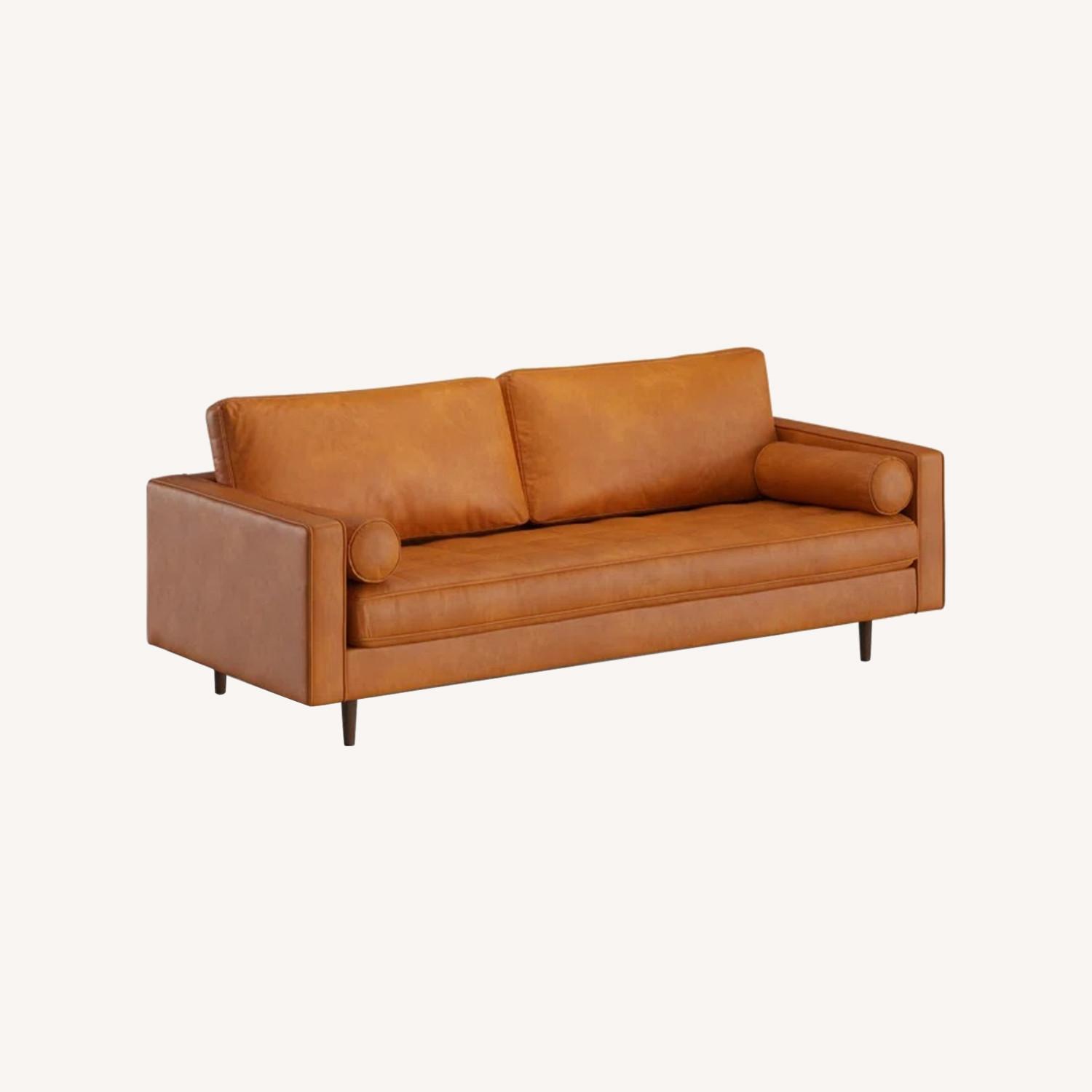 Seller's Notes:A tufted bench seat + tapered dowel legs make this sleek sofa a mid-century standout for your living room. It has a solid wood frame and is wrapped in durable genuine leather, so it's ready for everyday use. Foam padding and sinuous springs provide ample support. Welted seams + bolster pillows add a couple of tailored finishing touches.
