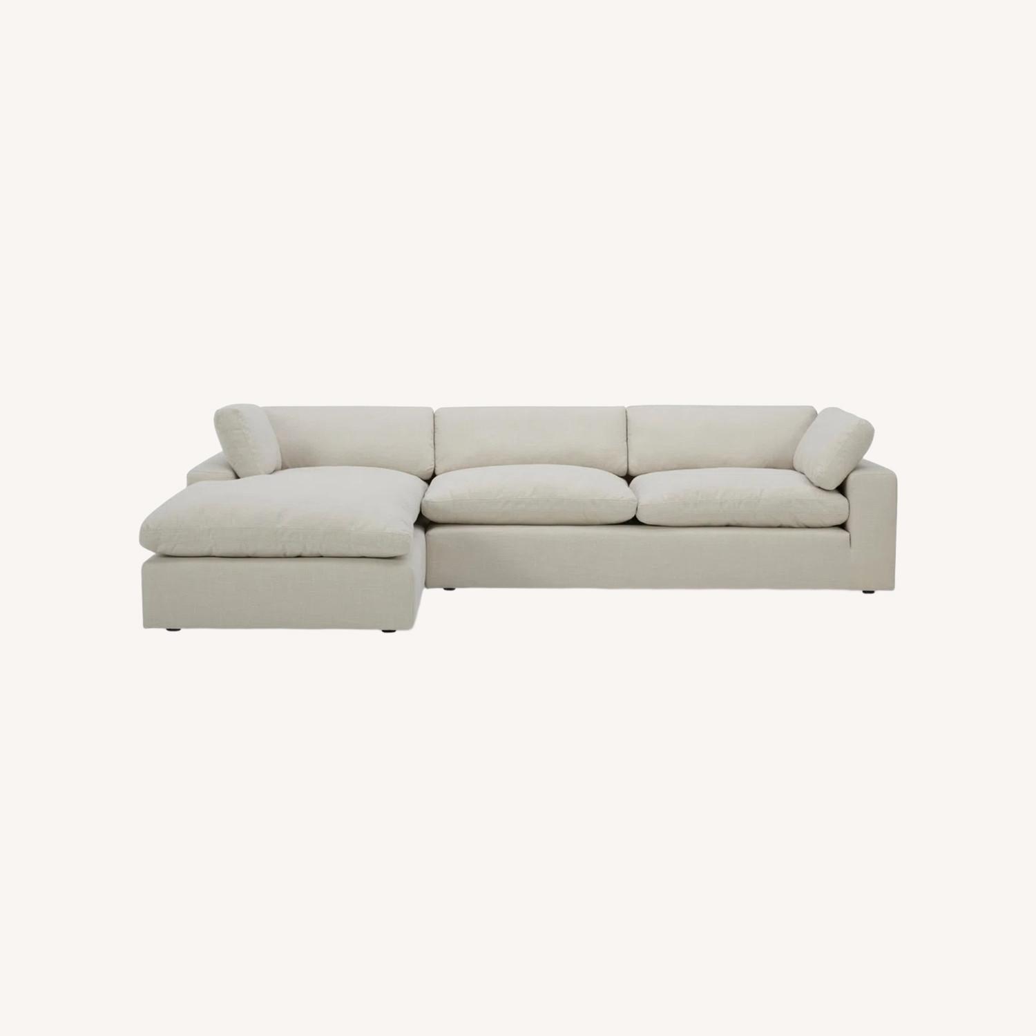 Seller's Notes:Spread out + lounge. This minimalist 2-piece sectional sofa grounds your living space with plush cushions made for relaxing. Upholstered in the neutral hue of your choice and filled with a down-blend, it features thick cushions and a low-profile design. Clean square arms and a low back modernize the silhouette. Two throw pillows are included.
