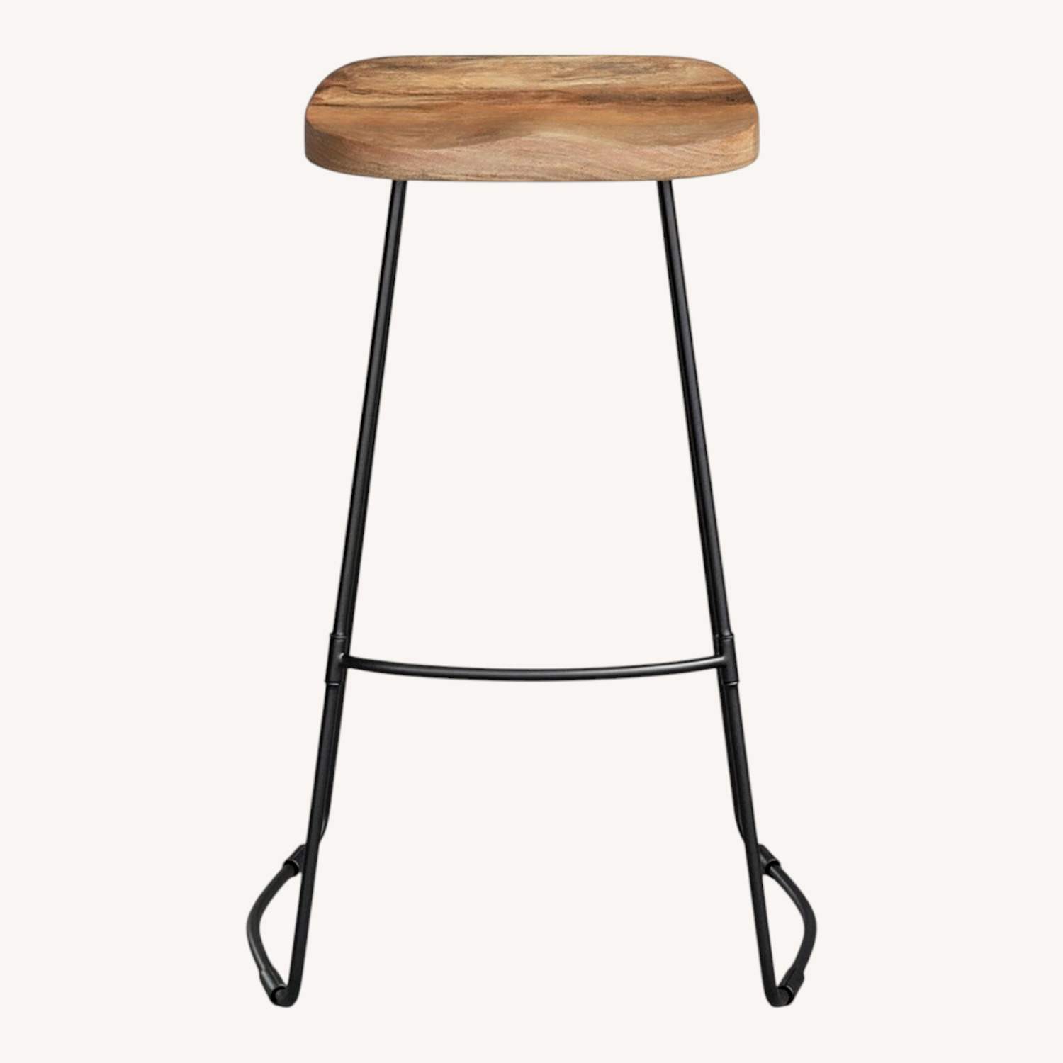 Mango smoothie. This stool’s curving seat is carved from solid mango wood, with natural grain variation that shines through its light finish. The footrest and sled legs are built from powder-coated iron for stability + industrial edge. Rubber foot pads keep your floors comfortable too.