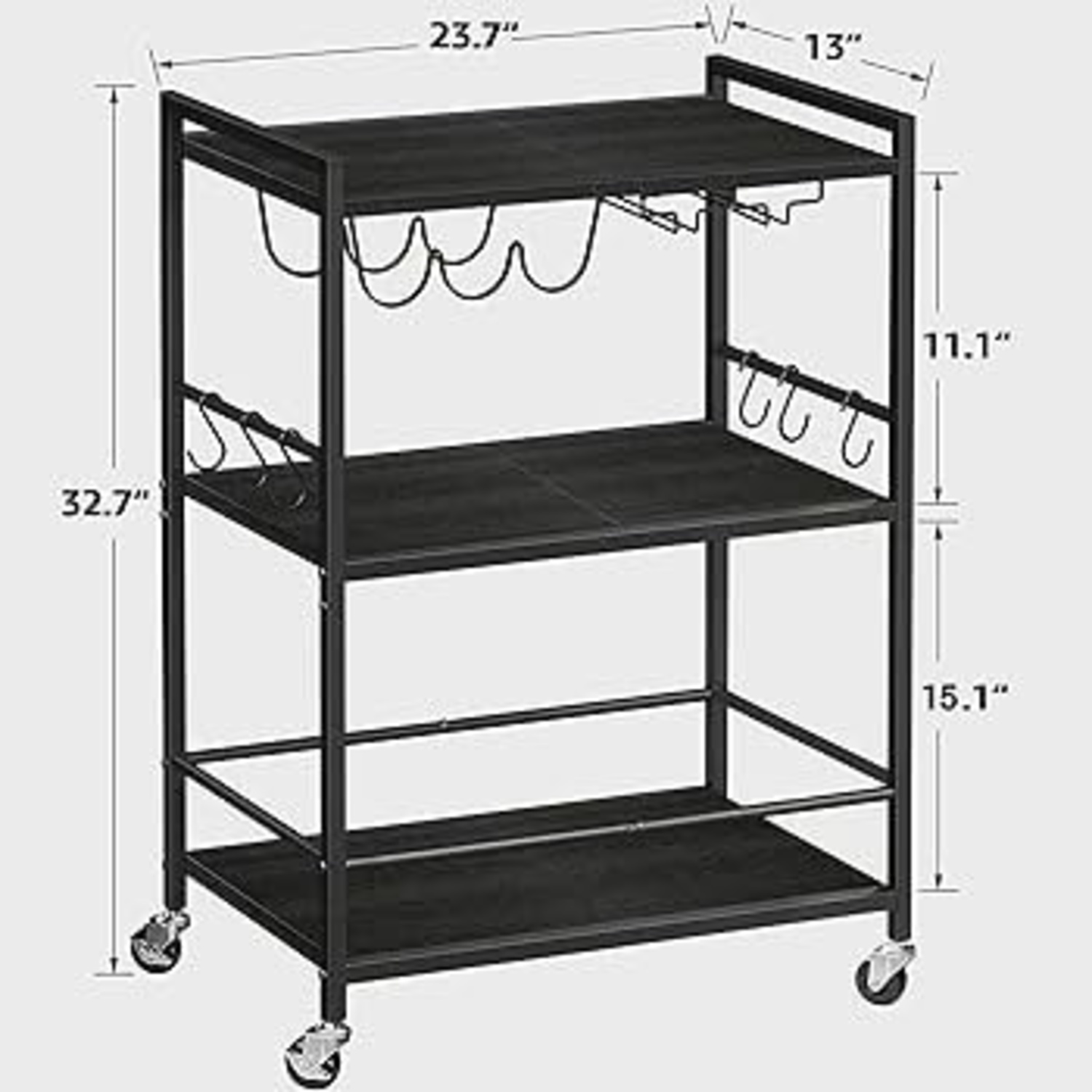 Seller's Notes:Metal [Multifunctional Cart] Our bar cart has 4pcs 360° rotating casters, 2 of which are equipped with brakes to prevent sliding when stopped. Except for being a bar servicing cart, it also can be used as kitchen cart, coffee cart, drink cart, microwave stand cart, make an accent statement in your entryway, kitchen, living room or office room with a decorative. [Handle/6S Hooks/Protective Fence] This serving cart equipped with handle that can control direction easily. Offer 6 S-shaped hooks that are perfect for hanging small utensils like mugs, cooking spoons, dry towel, baking gloves or whisk. And protective fence on the bottom shelf, prevent your wine/ glass bottle from falling, you can confidently display all your bar items. [Large Capacity] Size: 13"D X 23.7"W X 32.7"H , This bar cart with Wine Rack and Glass Holder on the first tier that can hold up to 6 wine glasses and 3 compartments for wine bottle storage. It can also be disassembled if you don't want to use it. 3 Shelves allowing it enough room to hold your drinks and snacks as well as making it convenient enough to place in any room.