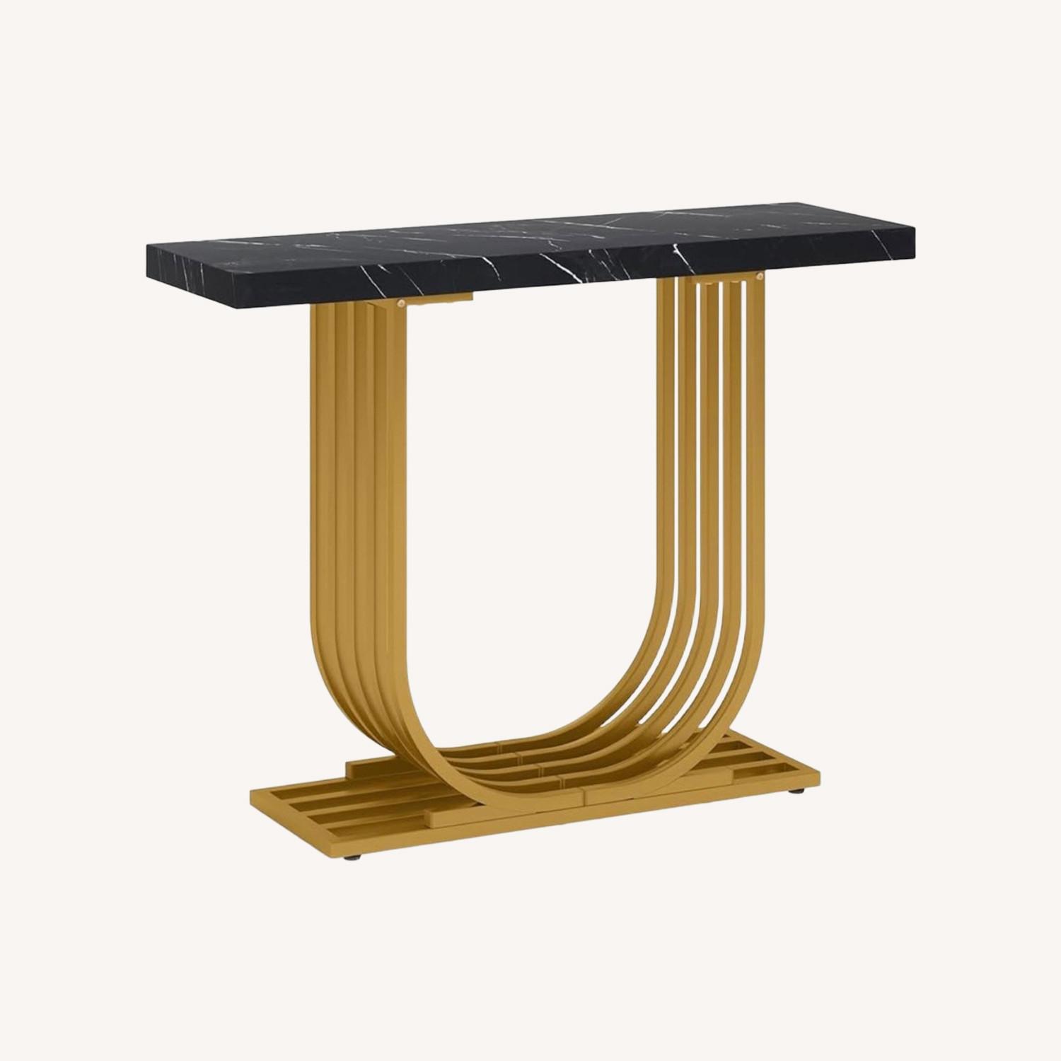 Seller's Notes:Tribesigns Modern Console Table with Gold Base, 39.37 Inch Faux Marble Entryway Table with Geometric Metal Legs Black & Gold Fully assembled entryway table. Bought it from Amazon a few years ago. Still in amazing condition.