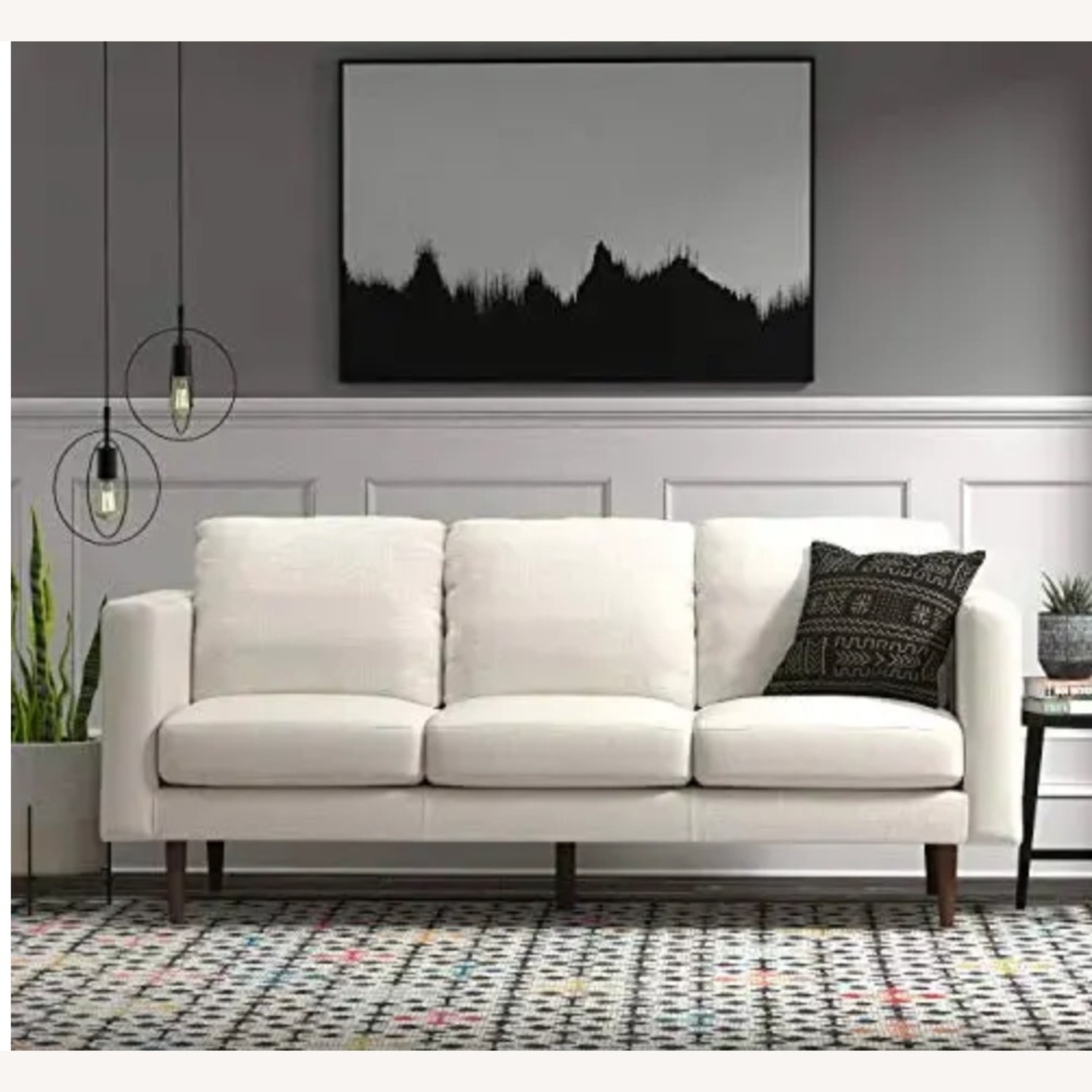 Seller's Notes:Amazon Rivet Revolve Modern Sofa – 80” Grey/Oatmeal color Current Retail Price: $975 Sleek, modern sofa with clean lines and square armrests, finished with tall tapered dark wood legs for a minimalist look that works with many décor styles. Dimensions: 79.9” W x 34.6” D x 35.4” H Details: Hardwood frame, solid dark wood legs, and durable upholstery designed for everyday use. Shows normal wear with some fabric fading, but overall in great condition and still very comfortable and sturdy.