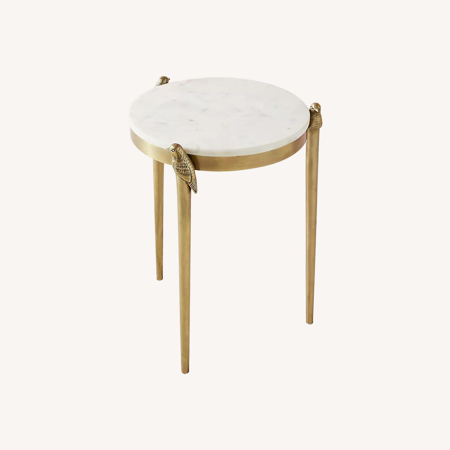Seller's Notes:Antique brass birds perch upon the columns of this marble-top piece, keeping watch over your living room while adding cheer to its decor.