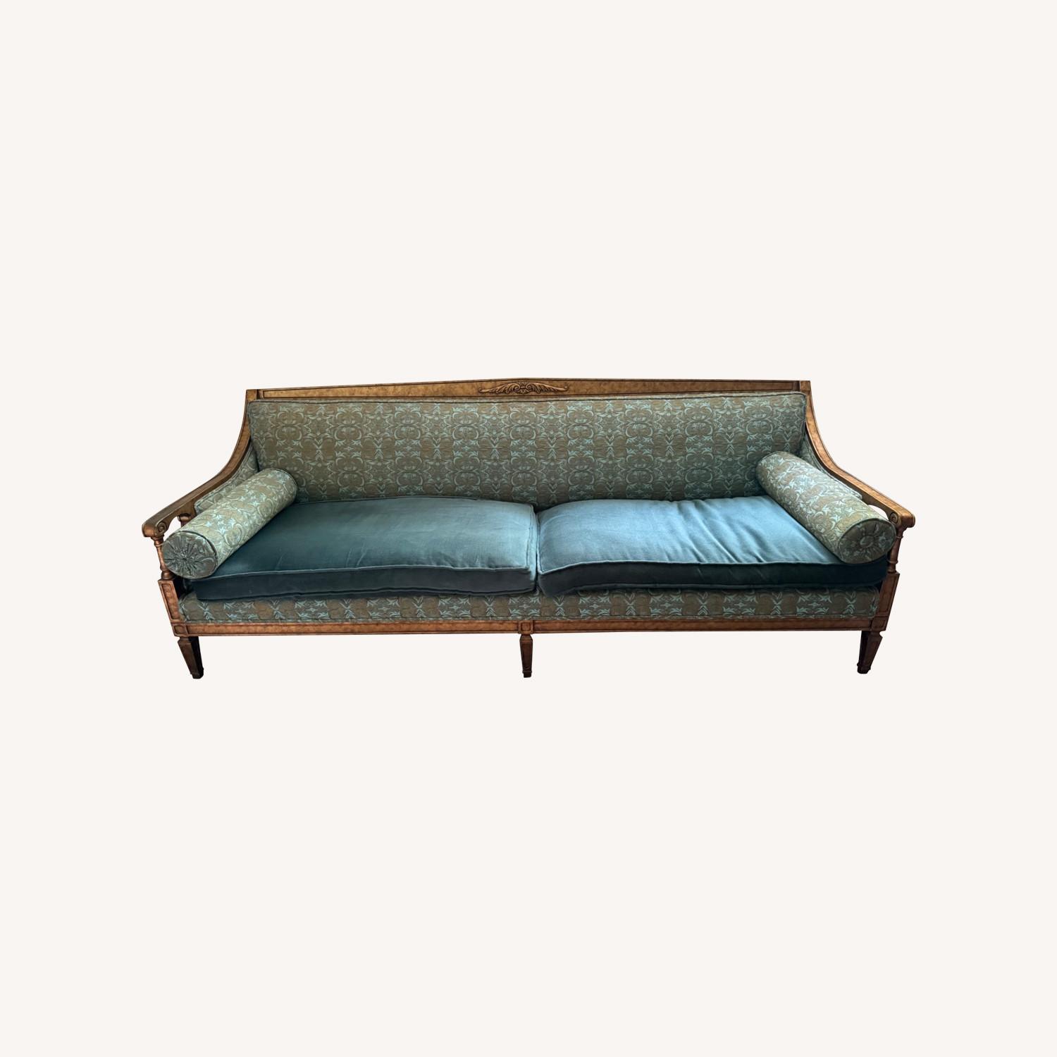 Seller's Notes:Antique 3/4 seater sofa, panted wood frame with green decorative upholstery.