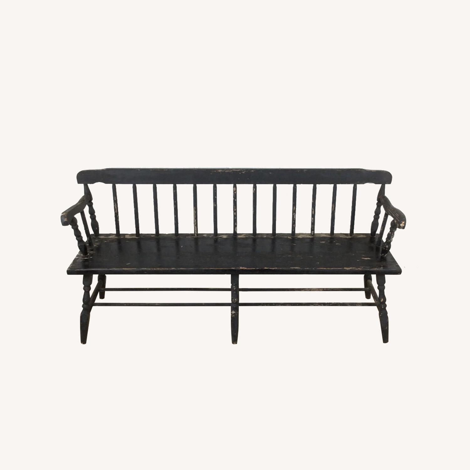 Seller's Notes:This antique Deacon's bench features hardwood construction, chippy black painted finish, sculpted arms, and stretcher base. Dimensions: 60w 18d 30h 17sh Condition notes: This antique deacon's bench features chippy black paint. It seems that a previous owner may have stored this item outside or in a screened porch because the wood seems dry and worn. The frame itself has a slight wobble. Joints have been tightened on the arms and back to prolong life. It can make an excellent occasional piece as is or is a good candidate for restoration. 6.5/10
