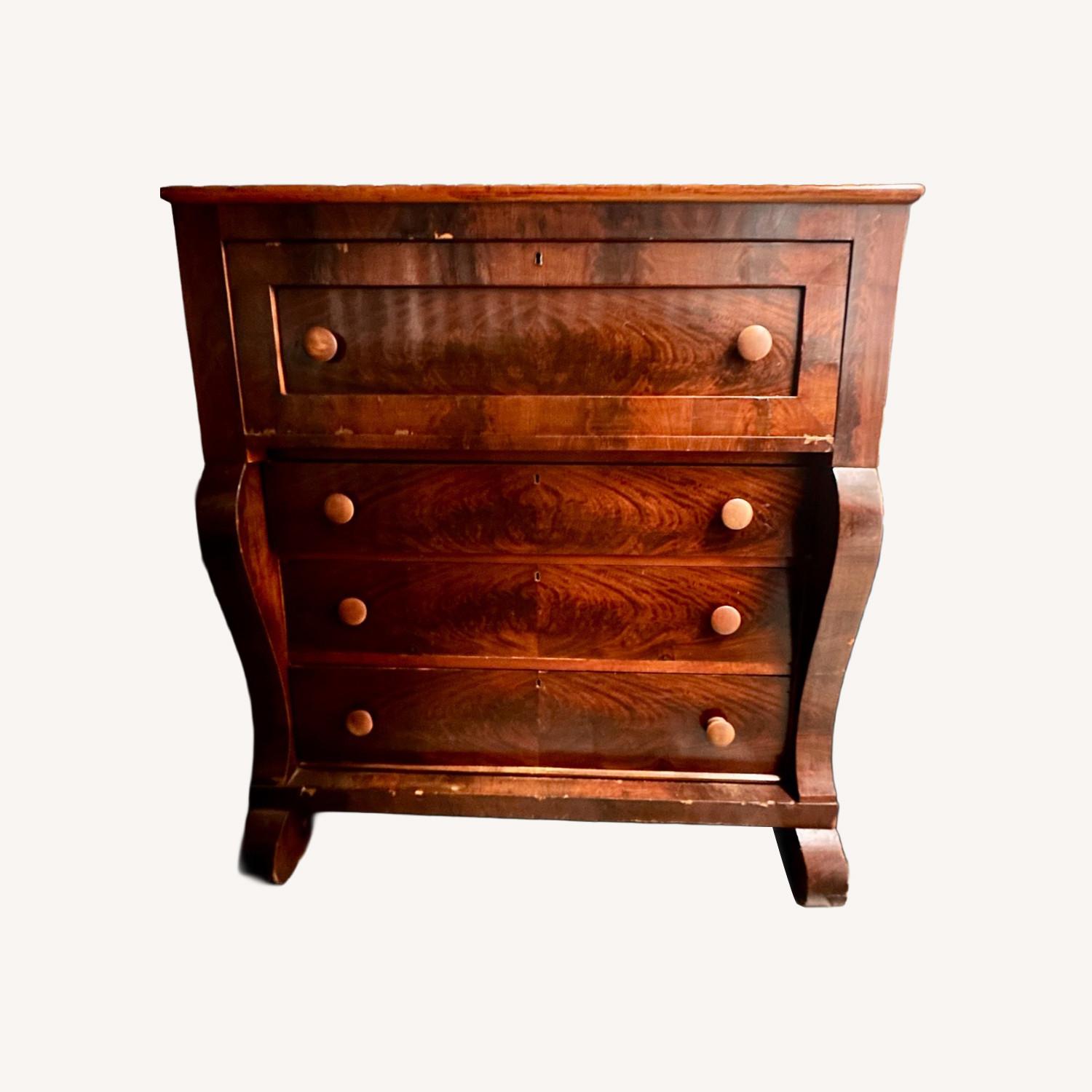 Seller's Notes:This dresser has been a great piece with hidden drawers and a fold down top. It's fully functional and has all of the knobs. It's great for anyone who loves a secret hiding place and a touch of whimsy. It's an antique in the American Empire style.