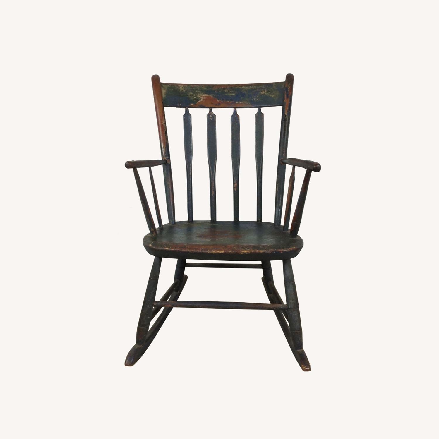 Seller's Notes:This antique children's rocker features. hardwood construction, spindle style arms and vintage black paint that has worn resulting in a beautiful patina. Dimensions: 19.5w 23d 31.5h 13.5sh Condition notes: This rocker is in very sturdy, solid condition. Arms are sturdy, base is sturdy. Paint has worn at edges resulting in an excellent patina. Please inspect photos carefully and contact with any questions prior to purchase. 8/10