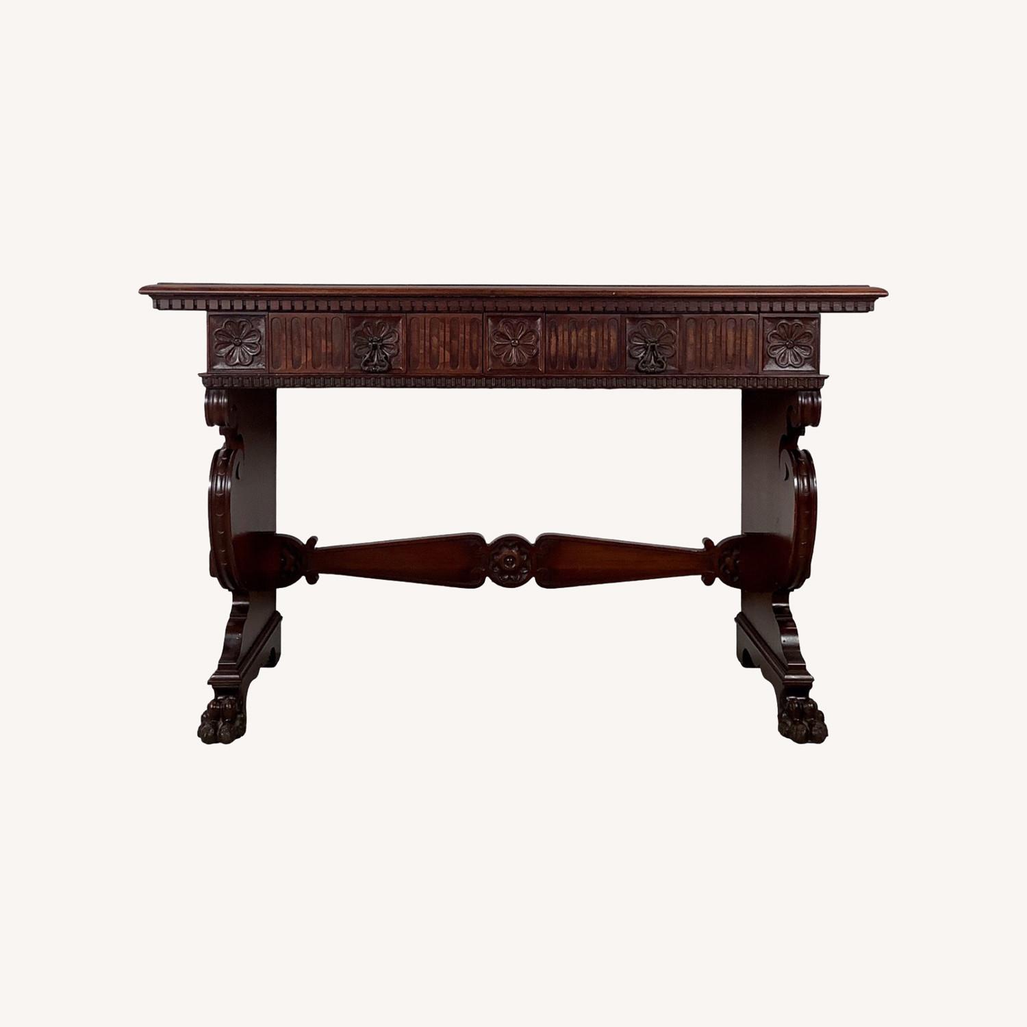 Seller's Notes:This antique table embodies the seriousness and architectural intent of late 19th-century Neoclassical Revival furniture. Rather than decorative excess, the design prioritizes proportion, structure, and classical ornament derived from architectural sources. The carved frieze features repeating rosette motifs framed by vertical fluting, creating a disciplined rhythm across the apron. These details echo classical friezes rather than French furniture traditions, giving the piece a pan-European academic character. Large scrolled end supports introduce Renaissance Revival influence, emphasizing mass and sculptural presence. The carving is deep and confident, with visible hand-finishing that adds definition and depth to the forms. The stretcher spans the width of the table and is centered by a carved boss, reinforcing symmetry and visual balance. Fully carved paw feet complete the design, grounding the table and underscoring its solid construction. The table is crafted from solid hardwood and finished in a rich brown tone with natural mellowing. The finish appears traditional and age-appropriate, without the high gloss or surface build associated with modern coatings. Equally suited as a console, serving table, or library desk, this piece was designed to be adaptable within formal interiors. Its scale and stability make it ideal for rooms that require both function and architectural presence. Dimensions: 48w 18d 30.5h 23.5h inside legs Condition: age appropriate wear, finish worn, scuffs and scratches, edge wear, discoloration, interior marks, dings, chips, see photos.