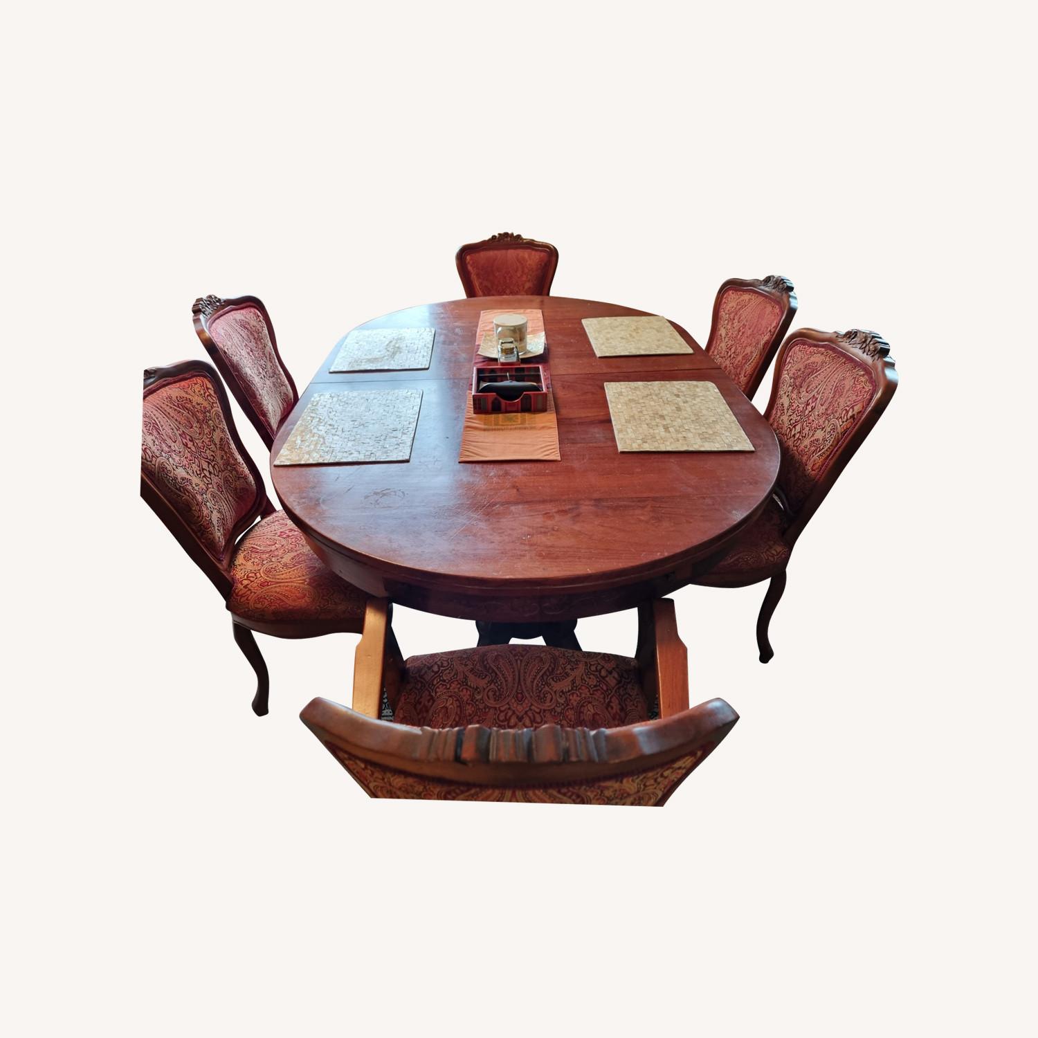 Seller's Notes:Solid teak-wood dining-table and 6 chairs, with hand carvings, Dutch designed, and imported from Indonesia. The 6 chairs have been recently re-upholstered.