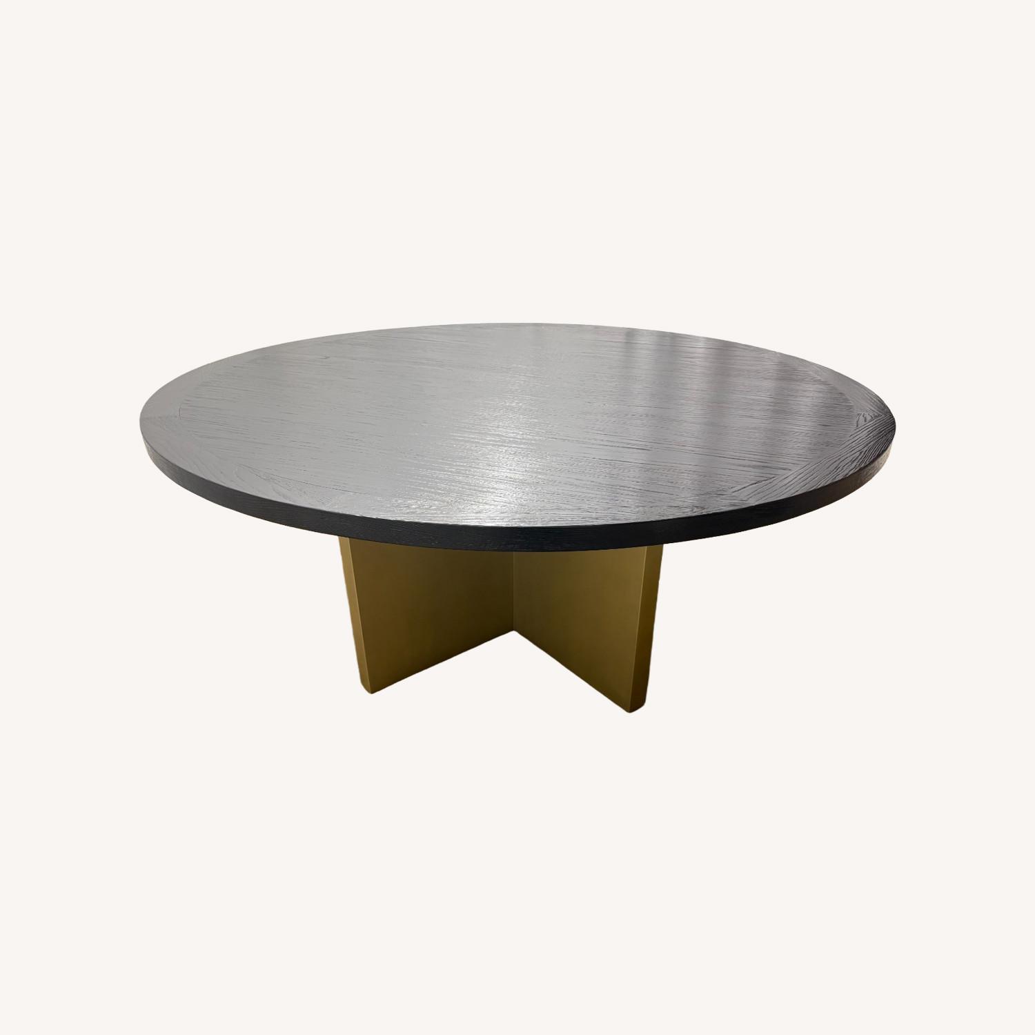 Seller's Notes:Arhaus Sculptural Pedestal Round Dining Table — 72" Deep Black Wood Top | Warm Antiqued Brass–Toned Metal Base Very Good Pre-Owned | Substantial Scale | European Contemporary Style Select images may be digitally staged for scale and inspiration. ──────────── SCULPTURAL FORM, STRONG PRESENCE This round pedestal dining table from Arhaus is a bold, design-forward piece defined by clean geometry and architectural presence. Featuring a generous 72" round tabletop paired with a sculptural metal pedestal base, the table anchors a dining space with confidence and balance. The deep black wood top highlights natural grain and organic character, while the warm antiqued brass–toned base introduces contrast and visual weight. The result is a table that feels modern yet timeless—equally suited to contemporary, transitional, and European-inspired interiors. With its substantial scale and pedestal construction, this table comfortably accommodates gatherings while maintaining an open, uncluttered feel beneath. ──────────── DETAILS & CONSTRUCTION • Tabletop: Wood construction with a deep black finish and visible natural grain • Base: Sculptural metal pedestal for stability and visual impact • Base Finish: Warm antiqued brass–toned metal with a softly aged appearance • Form: Round pedestal design for seating flexibility and balanced proportions • Construction: Solid, weighty build with excellent stability • Designed for everyday dining and entertaining ──────────── DIMENSIONS • Diameter: 72" • Overall Height: 30" (standard dining height) • Under-Table Clearance (Legroom): Approx. 28" ──────────── CONDITION | VERY GOOD PRE-OWNED The tabletop was manufactured in late 2021 and is considered lightly pre-owned. Overall, the table presents beautifully and has strong visual presence. The metal pedestal base is in pristine condition. The tabletop shows natural wood checking and organic grain movement, which are inherent characteristics of wood construction at this scale and finish. A few minor surface imperfections were present and have been carefully touched up and blended into the finish. Due to the organic nature of the wood and the deep black finish, these areas integrate naturally with the grain and do not detract from the overall appearance. The table is solid, stable, and ready for placement. ──────────── WHY THIS PIECE STANDS OUT • Authentic Arhaus dining table with sculptural pedestal design • Large 72" round top ideal for statement dining spaces • Deep black wood surface with rich natural character • Warm antiqued brass–toned base adds contrast and sophistication • Substantial construction with excellent stability • Refined alternative to mass-market pedestal tables ──────────── Arhaus Dining Table, Round Pedestal Dining Table, Sculptural Dining Table, Black Dining Table, Brass Pedestal Table, European Contemporary Dining Table, Statement Dining Table