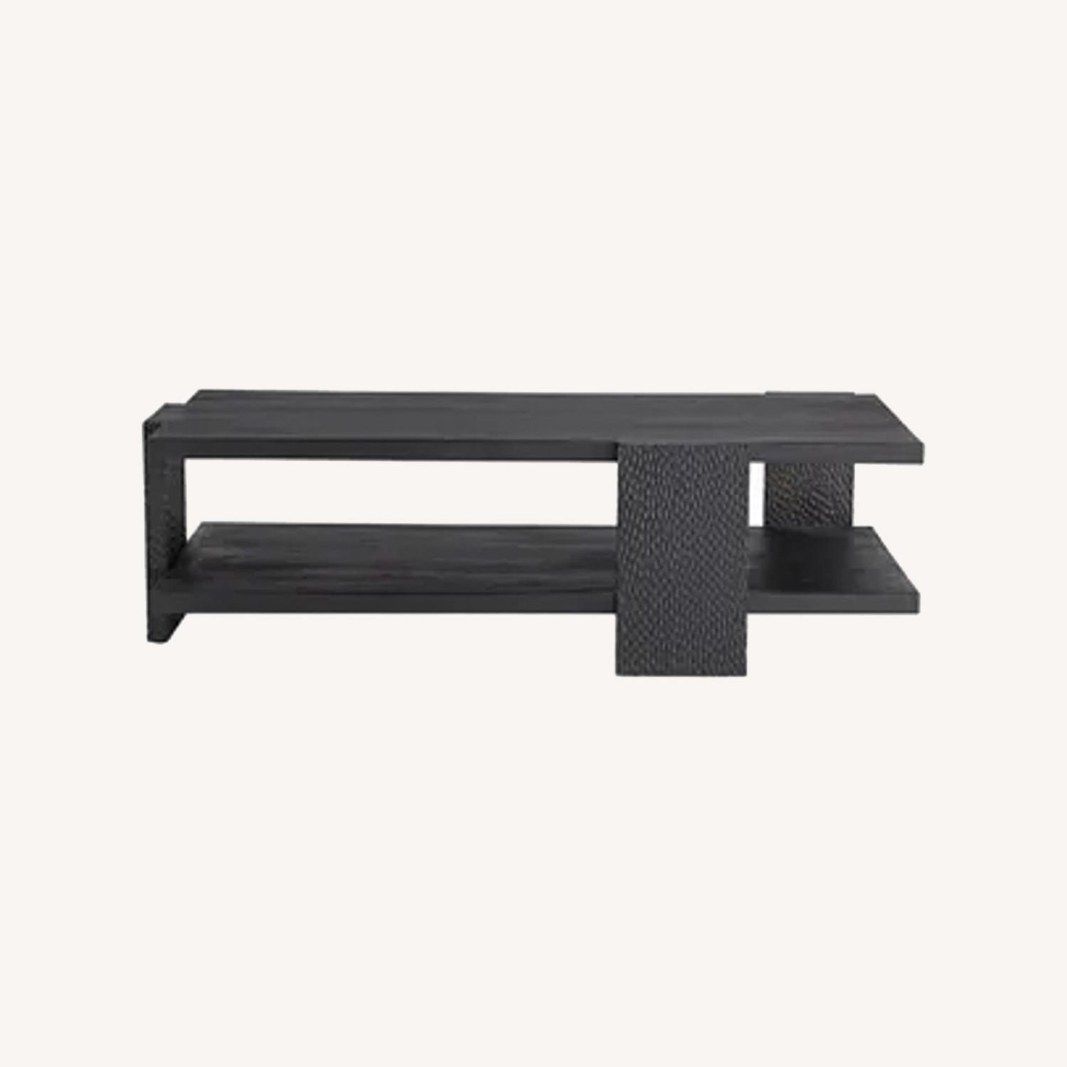Seller's Notes:The Aiden showcases a sprawling tabletop and a single shelf for storage. The hand-carved wood frame is finished in black. The entire piece is completed with a soft waxed finish, adding a slight sheen to highlight the organic carved, wire brushed texture.