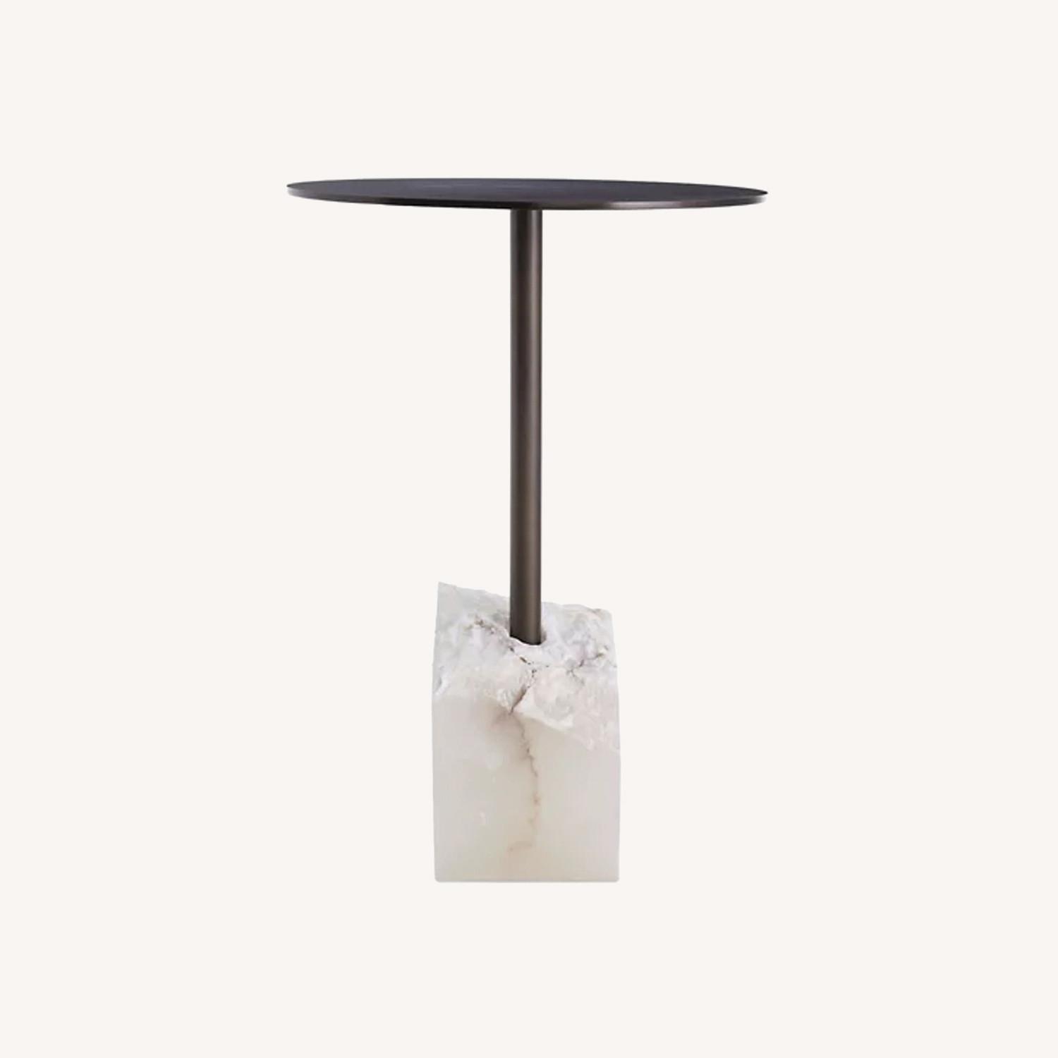 Seller's Notes:Roughly cut alabaster base with rich veining, metal column and top