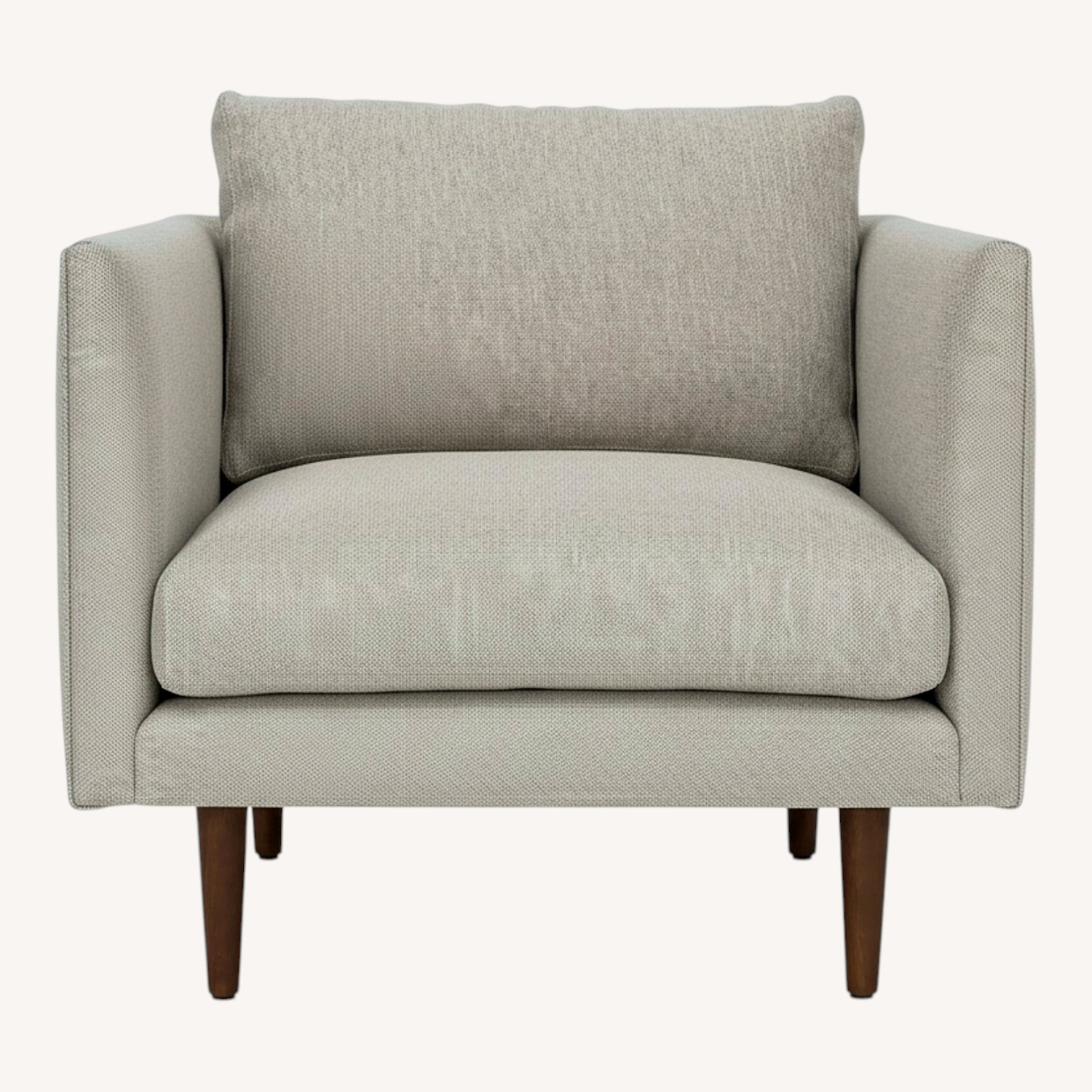 Seller's Notes:Clean modern armchair. Light gray fabric upholstery. Has comfy back cushion. Dark wood legs.