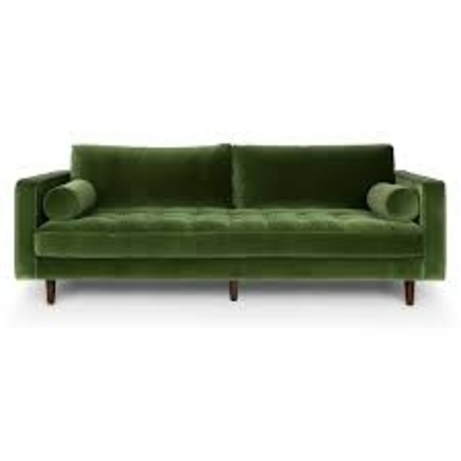 Seller's Notes: Environment: Pet-free & Smoke-free home The "Natural" Velvet Advantage This is the original Grass Green cotton-velvet blend (85% cotton / 15% polyester), which is no longer available from Article. Unlike the current "Plush" line made of 100% synthetic polyester, this fabric offers a more natural feel and a sophisticated matte-luxe finish. Condition & Comfort High Cushion Loft: This sofa has been barely sat on. The bench seat is firm with no dips or sagging, and the back cushions remain extremely plush. Fill: High-rebound foam topped with duck feathers for a soft, sink-in feel. Bolsters Included: Includes the two original matching round velvet bolster pillows. Seller Notes on Blemishes Water Marks: Some light water spotting/faint marks on the velvet, which is typical for the natural patina of cotton-velvet. Minor Scratch: A scratch on the back of the frame caused by an ethernet cable plug. It is not visible when the sofa is placed against a wall. Dimensions & Build Overall: 34" H x 88" W x 38" D Seat Height: 19" | Arm Height: 27" Frame: Kiln-dried solid wood with removable legs in a mahogany finish (excellent for narrow doorways).