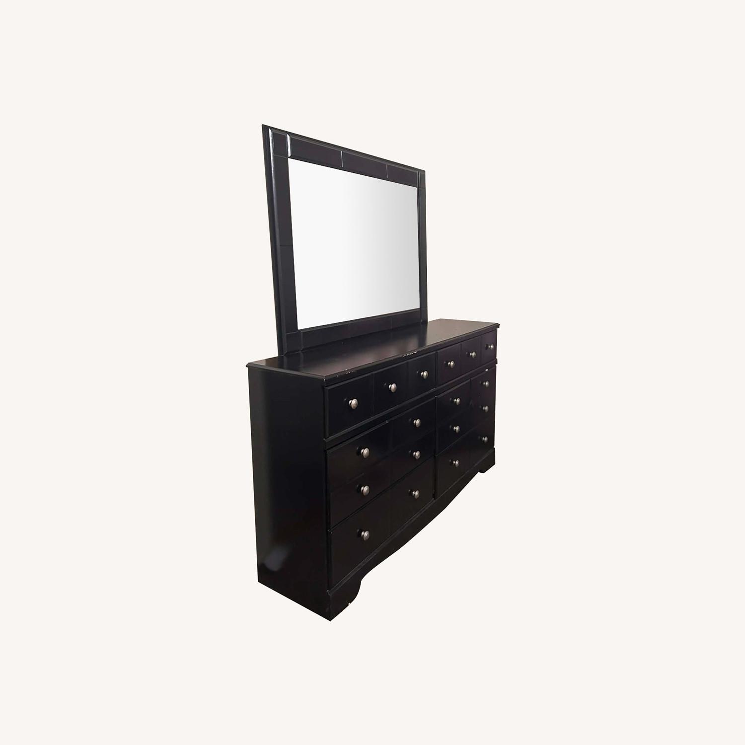Seller's Notes:Black wooden dresser with attached mirror in good condition. The mirror can be detached. Dimensions 63"W x 16"D x 72.5" H with mirror. Dimensions 63"W x 16"D x 36" H without mirror. Price negotiable. PICK UP ONLY. Please bring help.