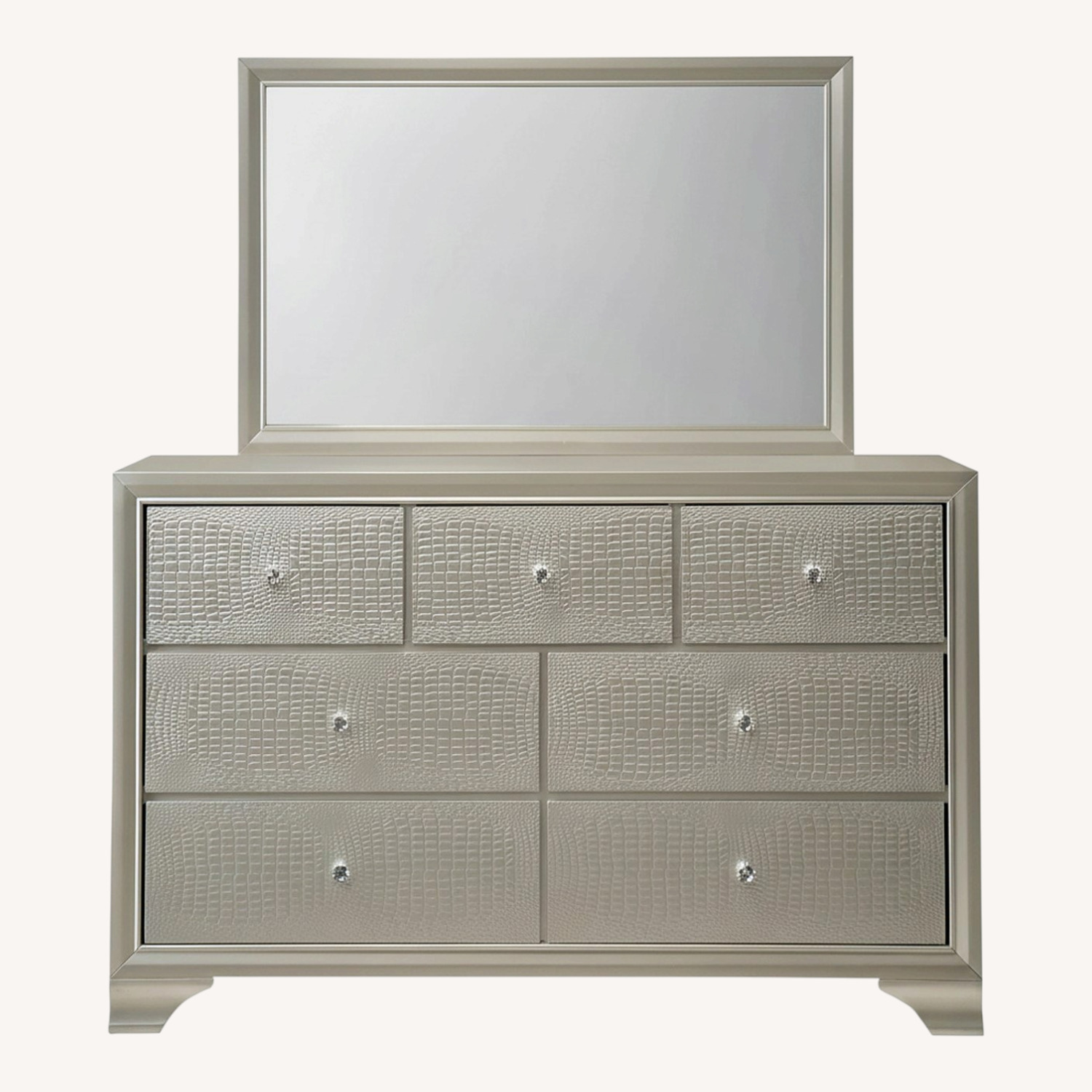 Seller's Notes:This Lyssa dresser from Crown Mark features a modern champagne finish with embossed crocodile pattern. French dovetail drawer fronts and English dovetail backs provide a strong construction for everyday use. Metal drawer glides will not buckle with humidity changes. Dustproof bottom seals your case and gives added strength. Decorative hardware accents the piece.