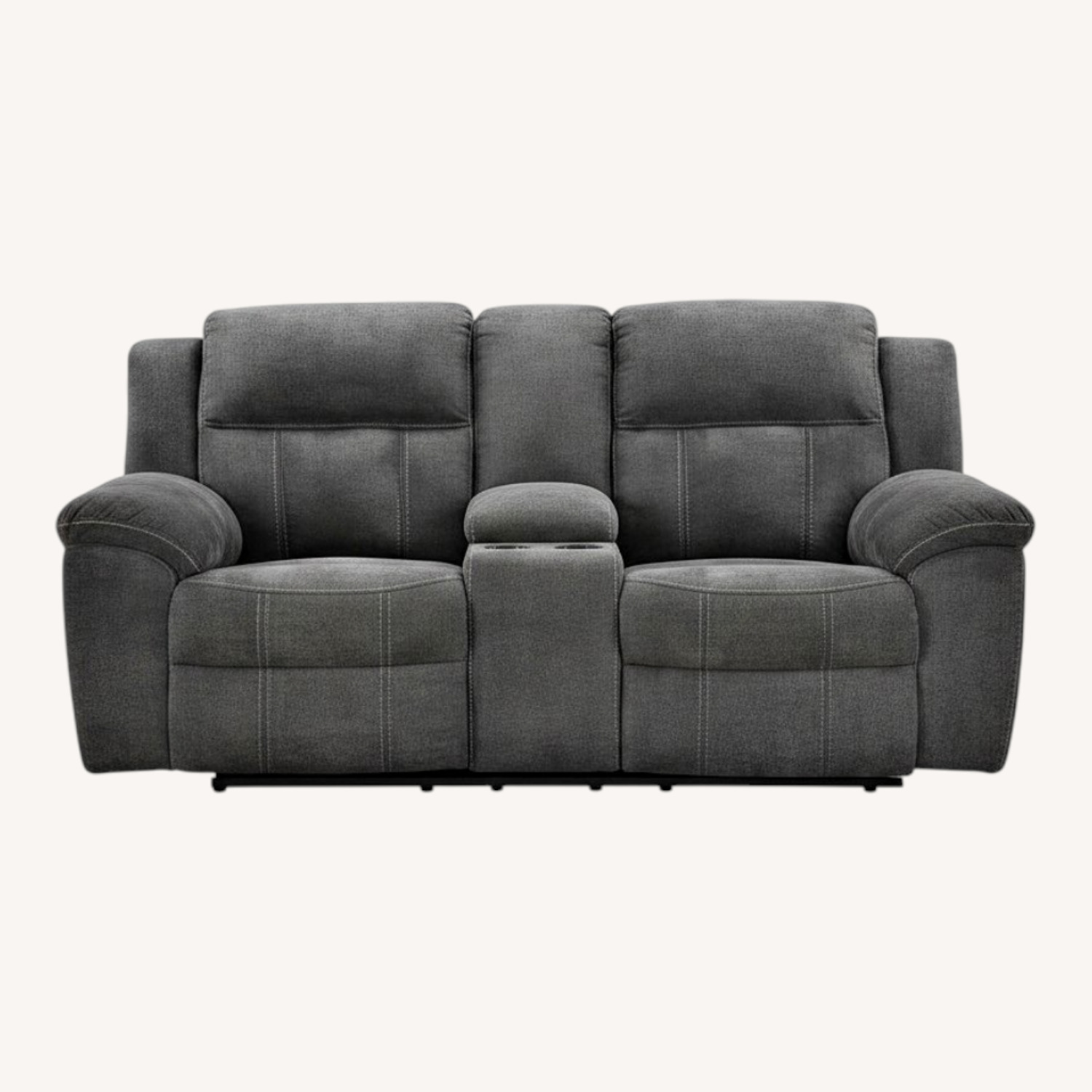 Reclining Comfort: Features a pull-tab reclining motion for easy adjustment and generously scaled seating with pillow-wrapped armrests for enhanced comfort. Durable Construction: Built with a corner-blocked frame and metal-reinforced seat, ensuring stability and longevity. Family-Friendly Fabric: Upholstered in charcoal Next-Gen Nuvella polyester, a soft, easy-to-clean, stain-resistant, and durable material. Integrated Console: Includes a convenient center console equipped with two cup holders and hidden storage for essentials.