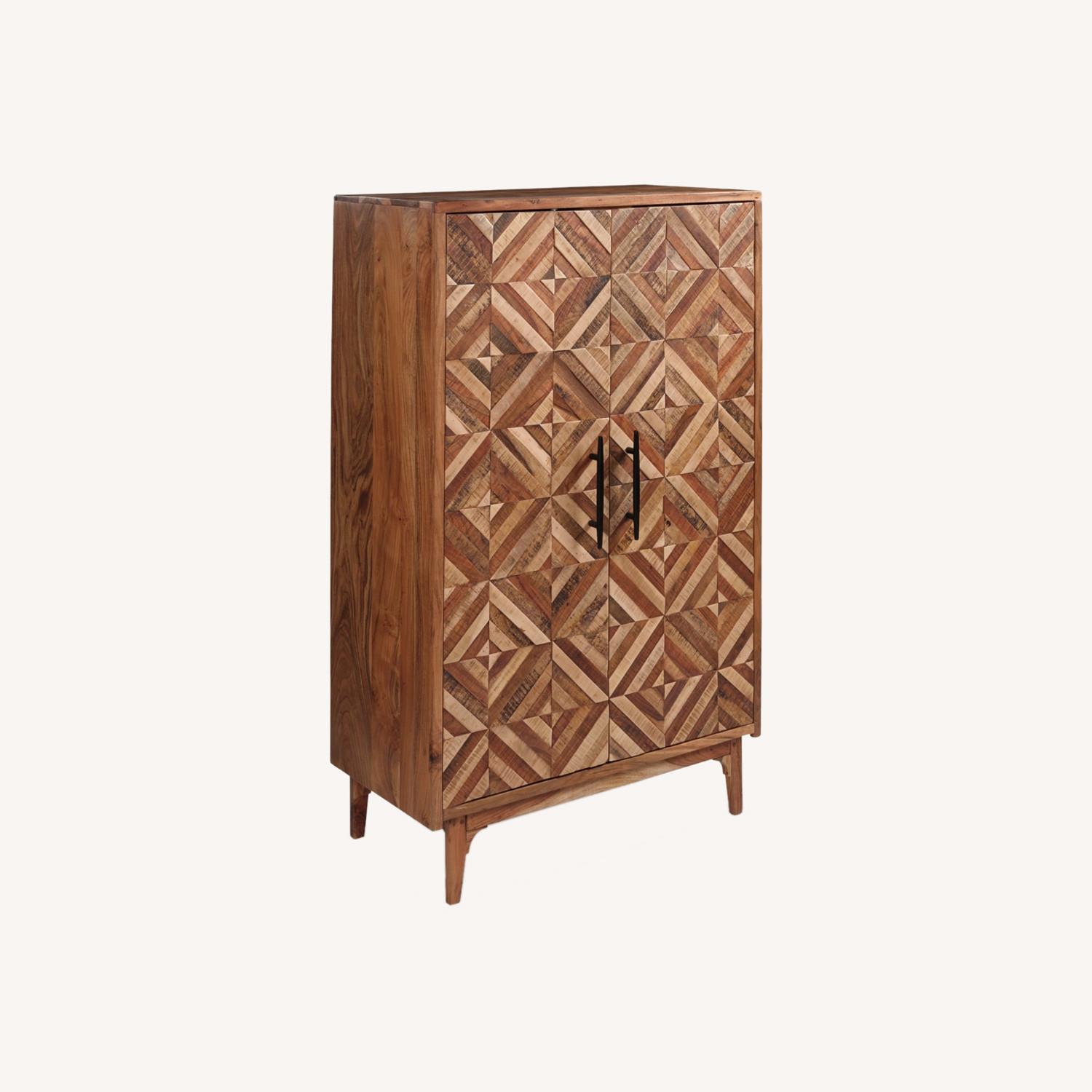Diamond life. Make a bold, brilliant statement with the Gabinwell accent cabinet. A decidedly contemporary choice, this double-door cabinet with two interior shelves wows with its diamond inlay patterned design and masterful mix of light and medium brown finishes. Mid-century style pulls add a retro-chic touch.
