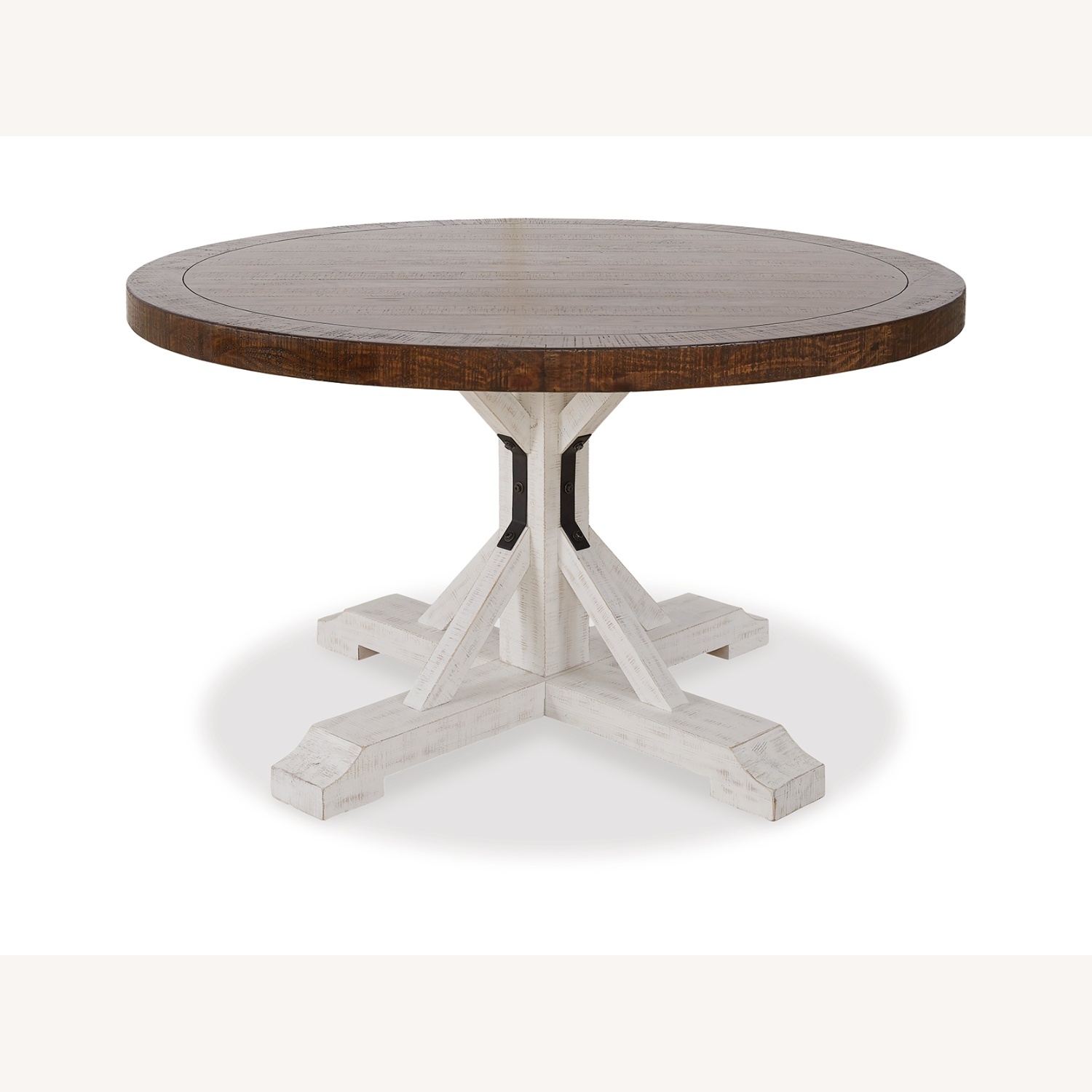 Seller's Notes:If you love rustic details full of charm and character, the Valebeck dining room table is made with you in mind. Its two-tone distressed finish pairs a rustic brown tabletop with a vintage white base for fresh farmhouse styling. This round table features a sturdy post and bracket base design, with black metal accents and a thick dining top that lends an earthy appeal.