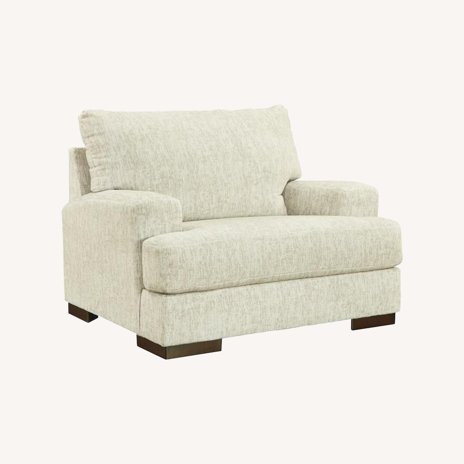 Product Description: Easy on the eyes and irresistibly comfortable, this oversized chair is covered in luxurious chenille microfiber in a light, neutral hue that blends beautifully in a room. Wide track arms have a contemporary look and plush cushions cradle you comfortably. Textured accent pillows in complementary colors add subtle contrast.
