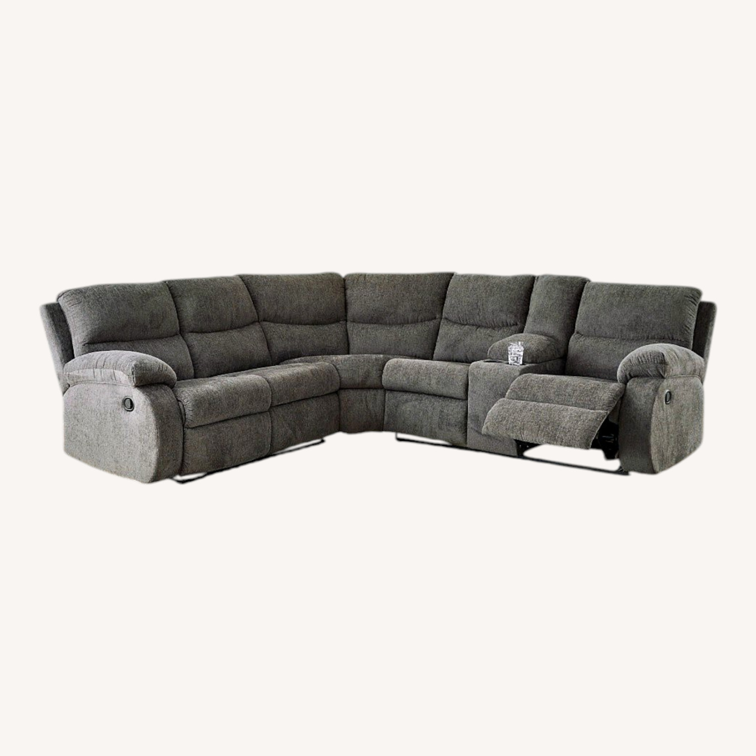 Cozy comfort is on the rise with the Museum reclining sectional. So velvety soft, the trendy pewter-hued chenille upholstery is made for everyday indulgence. Overstuffed and stylishly wrapped, the sumptuous cushions and pillow top armrests display the comfortable side of contemporary. A padded center console with hidden storage and dual cup holders blends form and function. And with one easy pull, you're on your way to endless relaxation with plenty of room to stretch out.