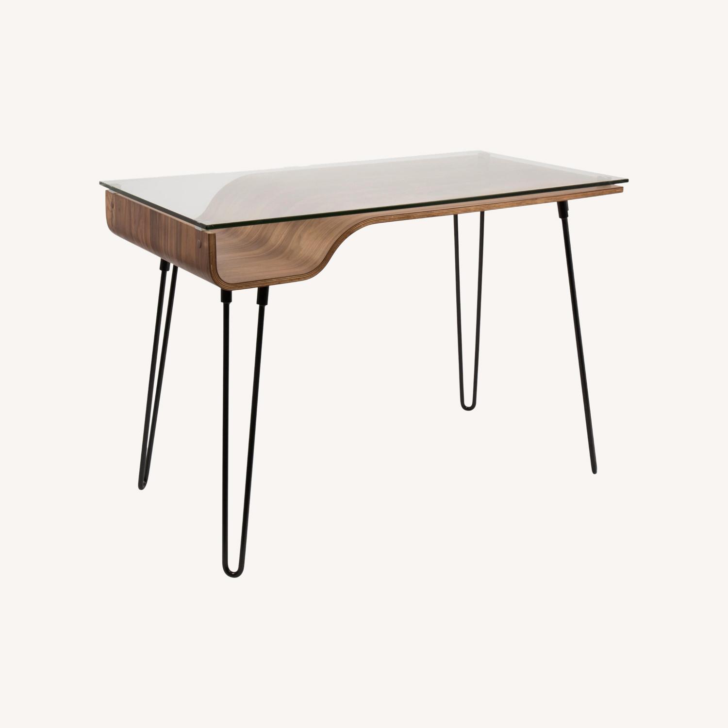 Seller's Notes:This is our LumiSource Avery desk, which we’ve really enjoyed using as a home office desk. It has a clean glass top with a warm wood detail and black metal legs, so it feels light and modern but still substantial.
