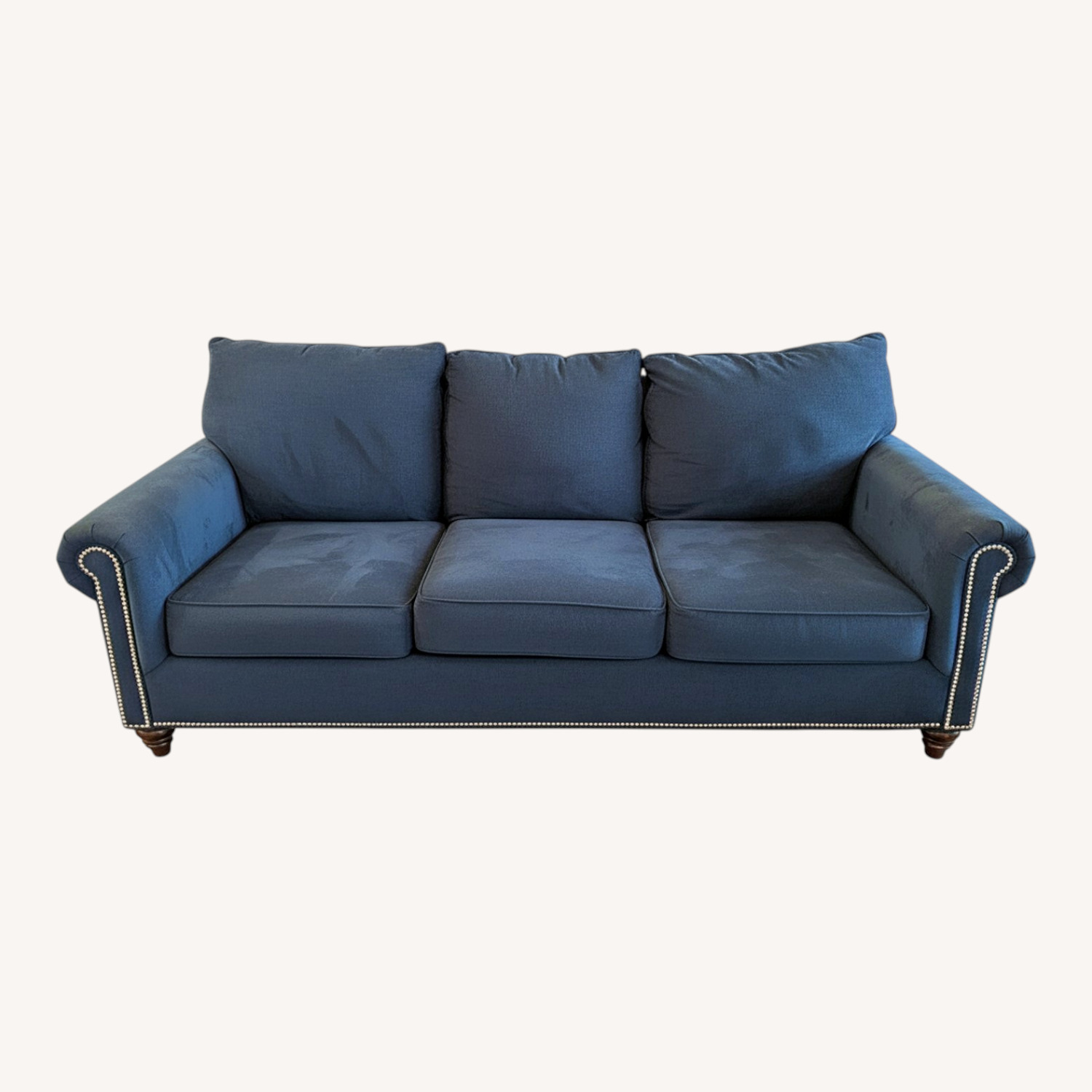 Seller's Notes:Beautiful custom designed couch blue from Bassett Furniture, originally purchased new and thoughtfully selected for both style and comfort. This piece has been well cared for and is in great condition, with plenty of life left. Custom Bassett design, classic timeless blue upholstery, included 2 throw pillows, comfortable and sturdy, from a clean smoke free home. This couch is approximately 9 years old but has held up really well and still looks great in a living space. Perfect for anyone looking for a high quality stylish sofa without paying full retail.