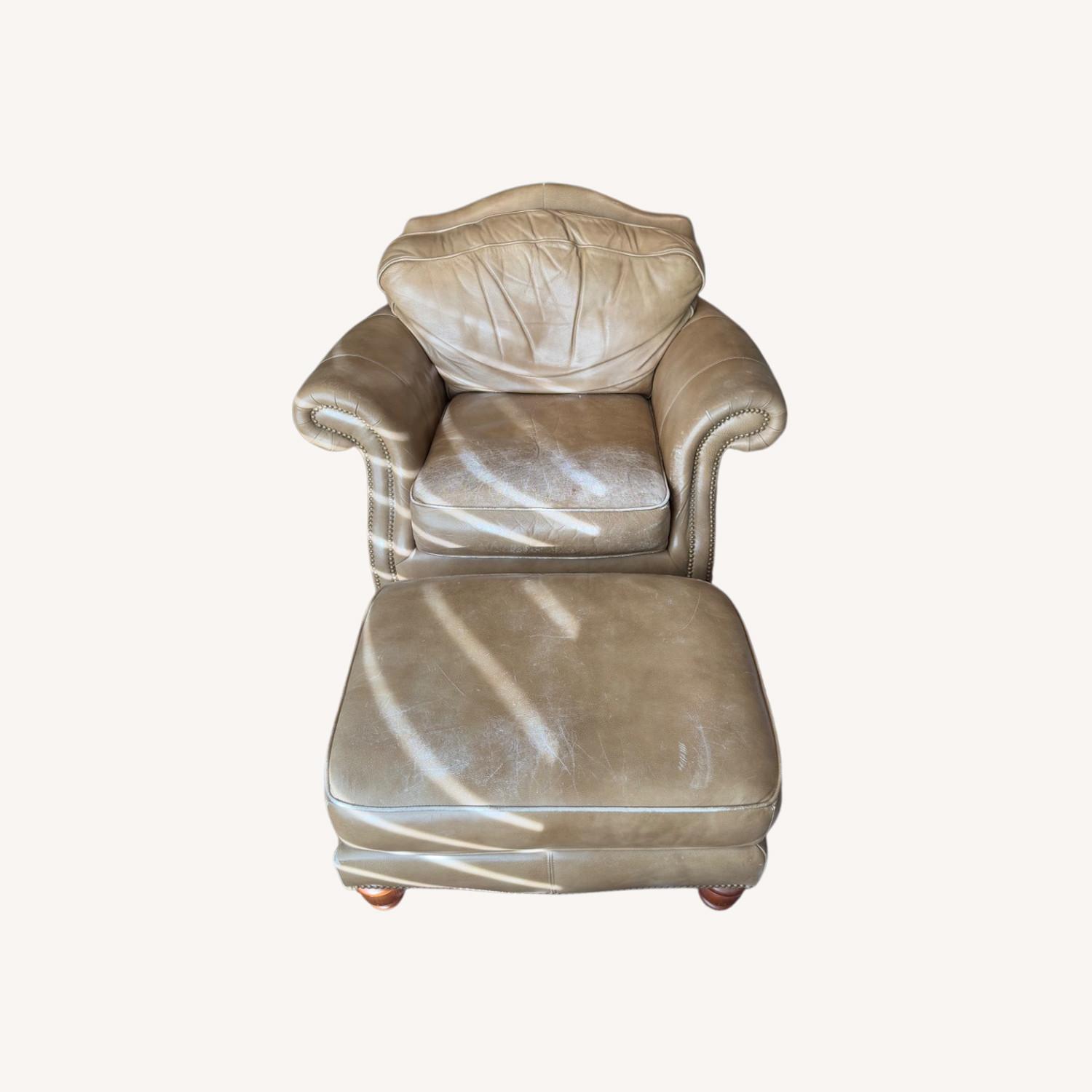 Seller's Notes:Wonderful, comfortable large leather arm chair. Great for reading! Redecorating and would love to move this chair and matching ottoman to a good new home.