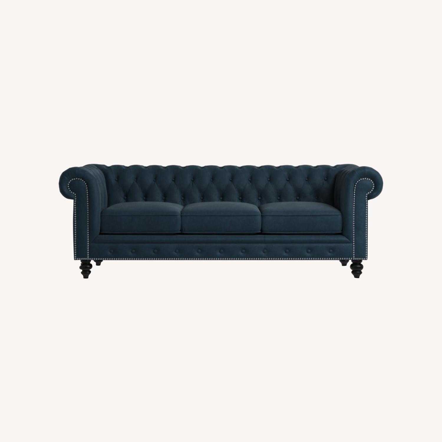 This Chesterfield sofa brings seating and a focal point to any living room. Its frame is made from solid wood and topped with polyester upholstery in the color of your choice. The cushions are stuffed with thick foam and supported by sinuous springs that prevent sagging over time. The button tufting, rolled arms, and bun feet speak to its craftsmanship.