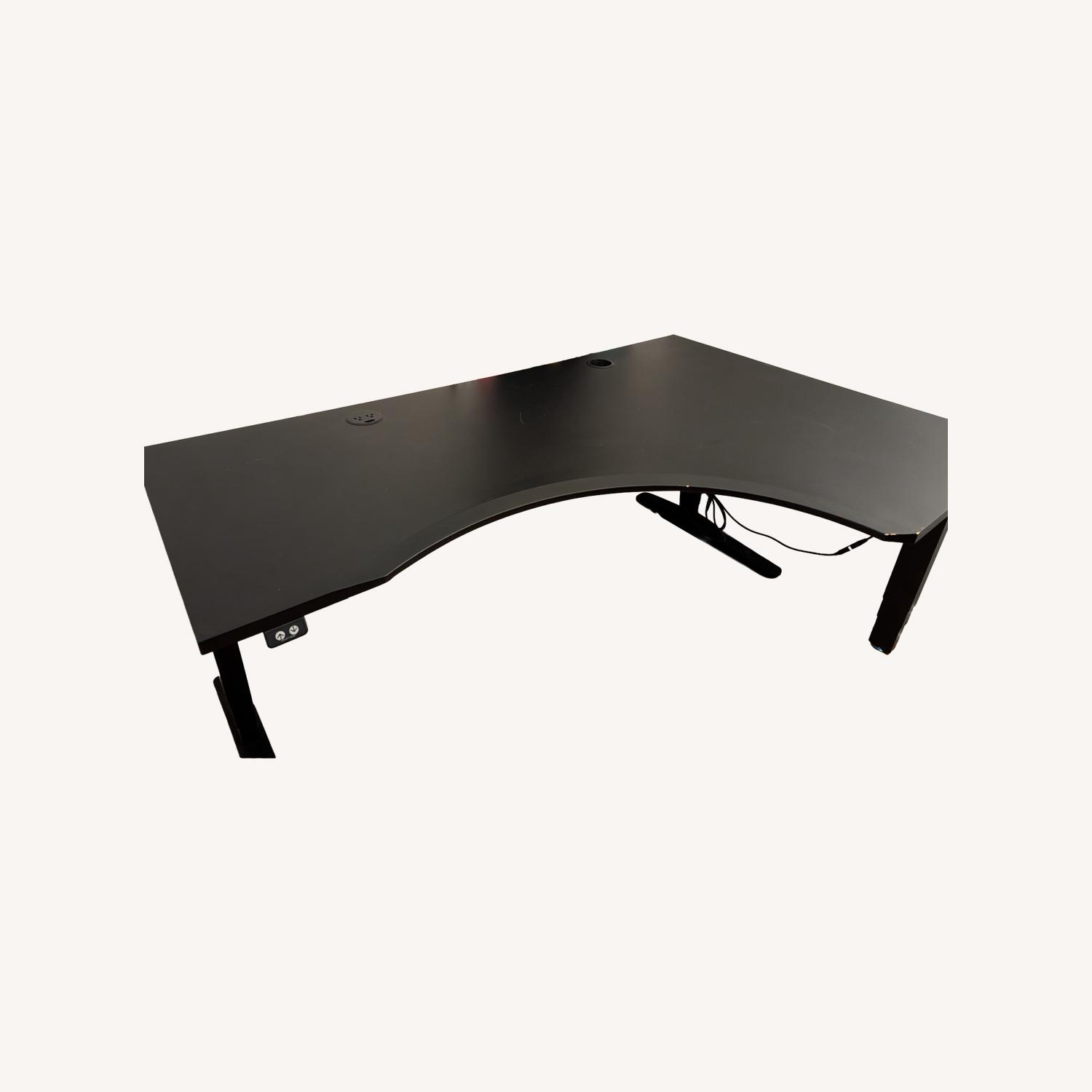 Seller's Notes:This is an UPLIFT V2 electronic standing desk in a curved L shape form, giving you a ton of desk space for work or hobbies. It has a couple of minor chips on the very front of the desk where the wood is exposed, but otherwise has all the parts and is in great condition. While the height is listed as 40 inches it's completely adjustable.