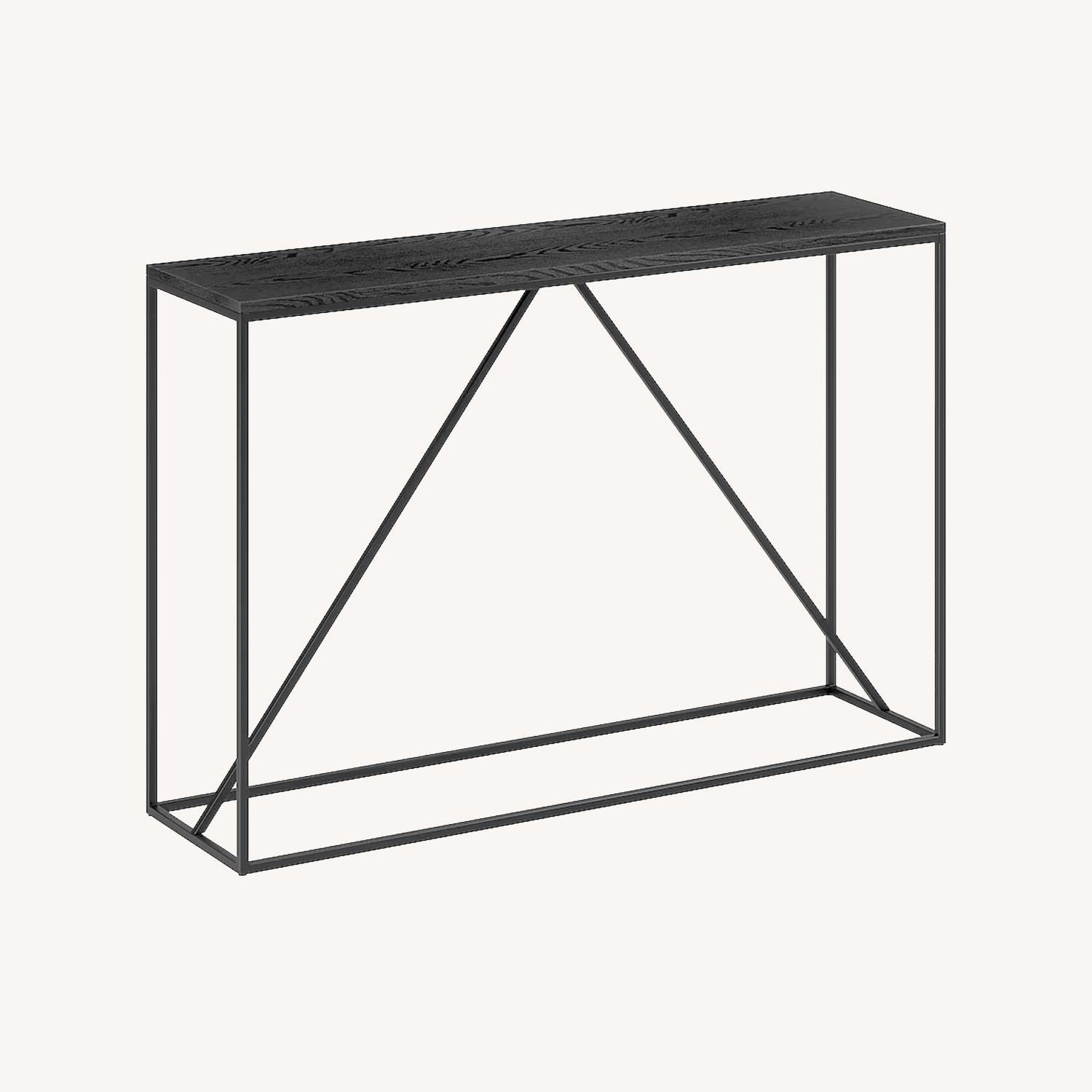 This console table is built for utility and design, featuring an on-trend wood-look top with a 40 lb weight capacity It's thouroughly modern blackened bronze frame features a diagonal center support that adds stability and visual interest Its narrow profile makes this a perfect choice for compact spaces where you need that extra bit of storage