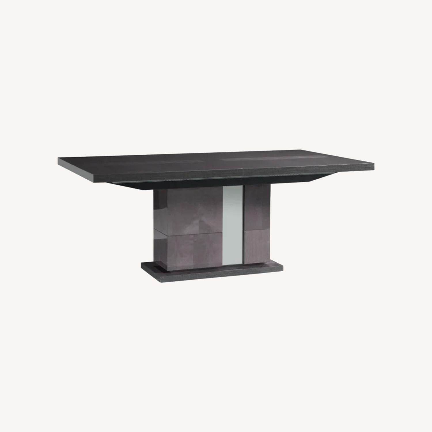 Seller's Notes:Imported from Italy, high gloss dinning table with 8 silver accented chairs. Well kept and versatile with removable inlet for expansion 77” - 98”. Color is a Black and chairs are a beep blue with chrome legs and silver studs.