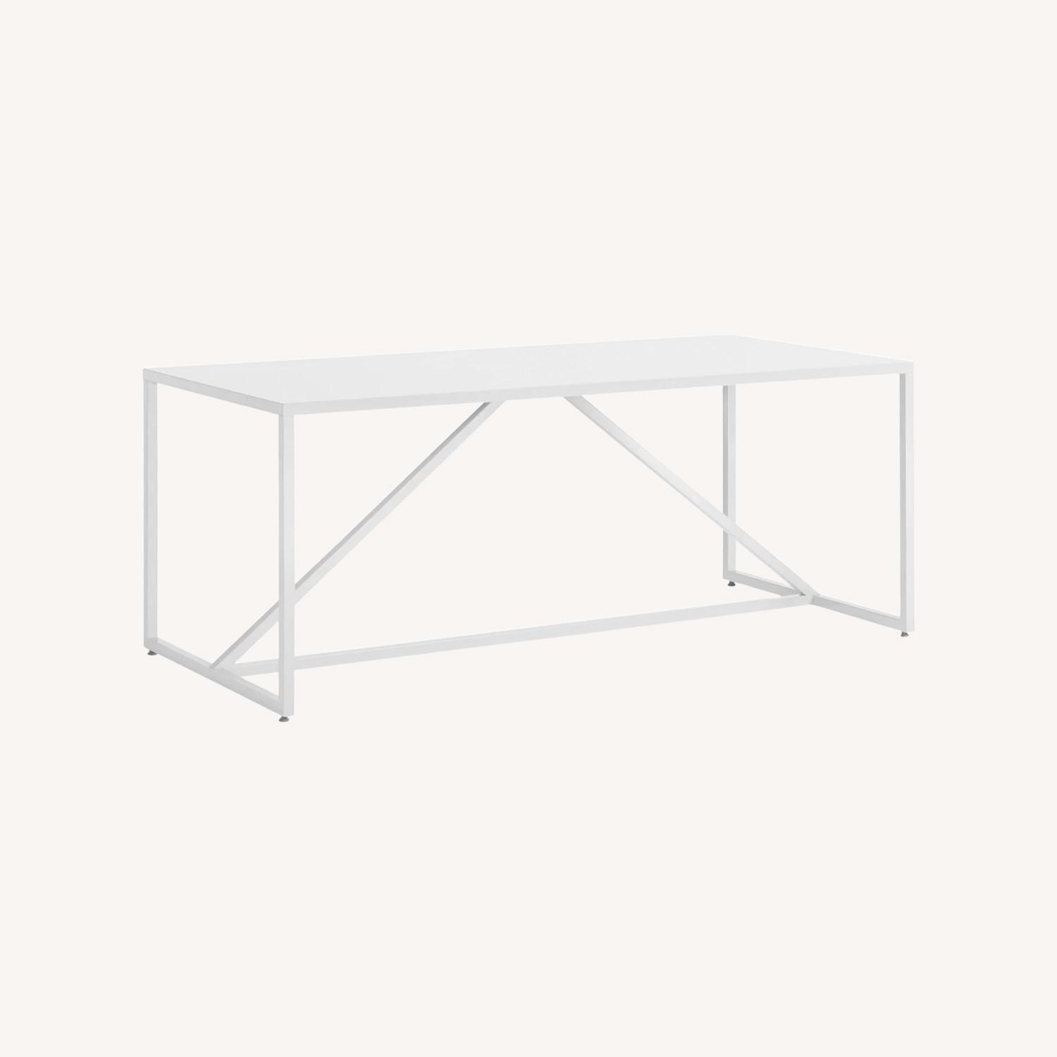 Seller's Notes:Beautiful Blu Dot Strut Dining Table in white. This modern dining table seats 6 comfortably (up to 8 max) and features architectural angles with a powder-coated steel frame and glossy polyurethane finish. We've had this table for 5-6 years and it has been extremely durable and reliable. It has a few minor nicks from normal use but is otherwise in great condition. The table is definitely heavy and substantial, which speaks to its quality construction. One of the best features is that it disassembles very easily for moving - it has successfully moved with us twice with no issues. We're only selling because we're getting a new table to accommodate our growing family.
