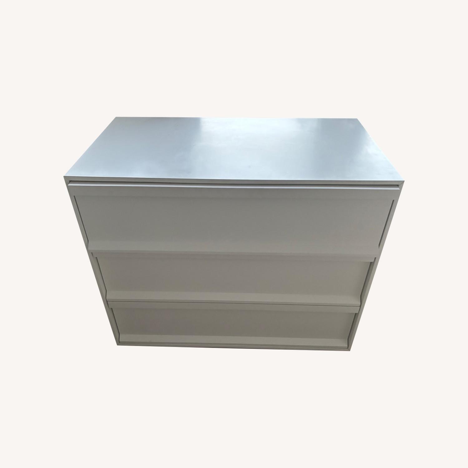 Tranquil staple. Crisp lines and unassuming relief pulls conspire to keep the action behind soft close drawers. A matte painted finish in muted tones delivers serenity and sets up a streamlined storage solution for the living room, bedroom and office.