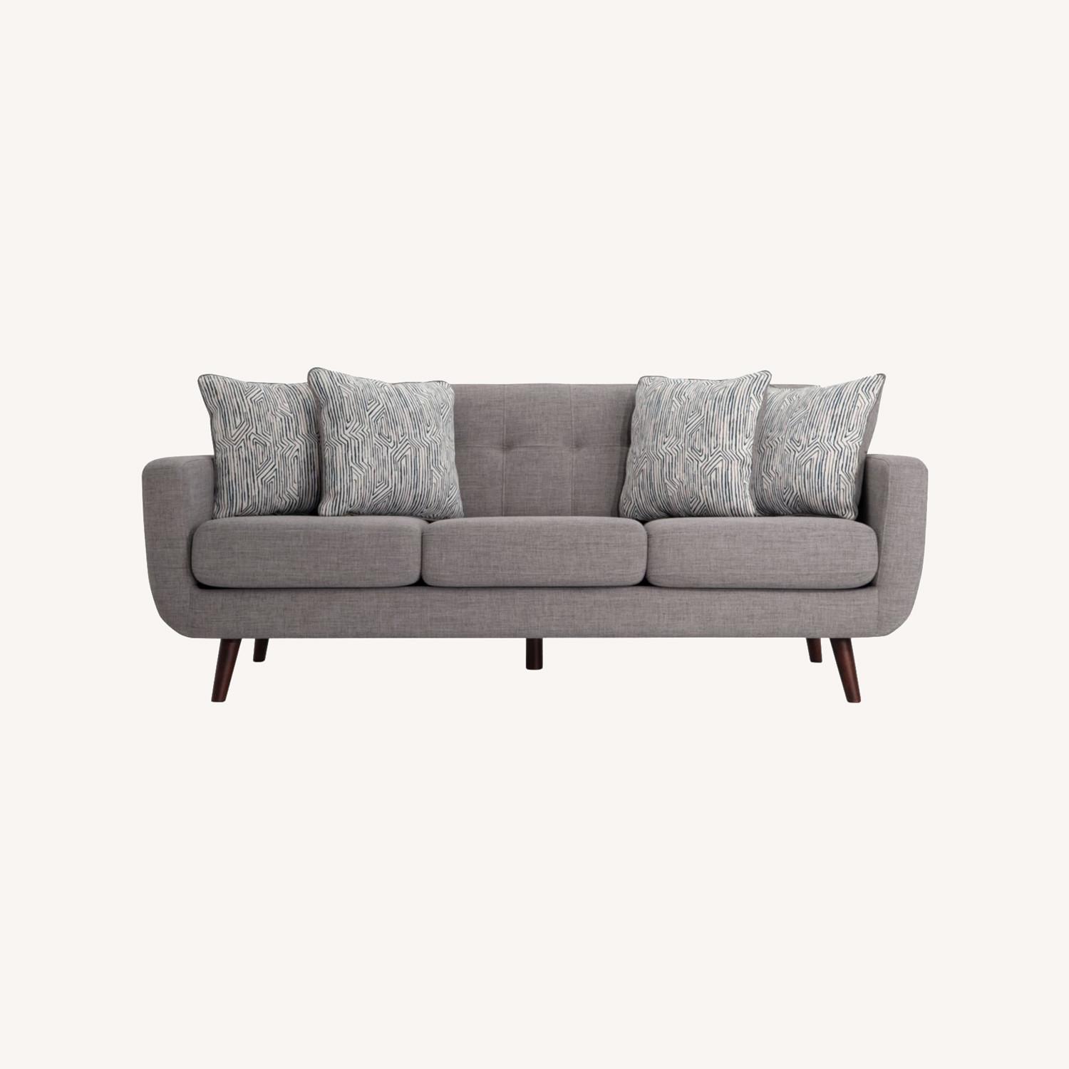 Seller's Notes:Stylish mid-century modern couch from Bob’s Furniture. Comfortable and stain resistant seating, sleek wooden legs, and track arms in a versatile tufted gray fabric. Comes with four accent pillows! Memory foam cushions!