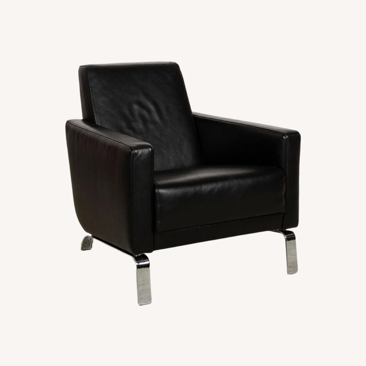 Seller's Notes:The Fly armchair by BocConcept is covered in black genuine leather and stands on high-gloss, inverted runners. The square basic design of the seat body and the elegance of the feet ensure a timeless look.
