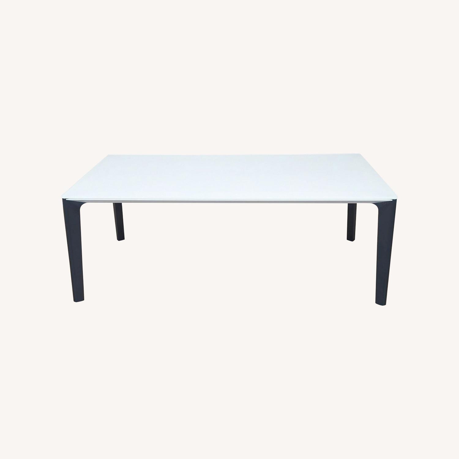 Seller's Notes:Made in Italy, the Bontempi Casa table Versus model was designed by the tenured designer Carlo Bimbi. It has a sturdy metal frame and solid wood legs finished in a lacquer of neutral color. The top is white matte anti-etch, scratch-resistant, lacquered glass in a velvet matt finish.