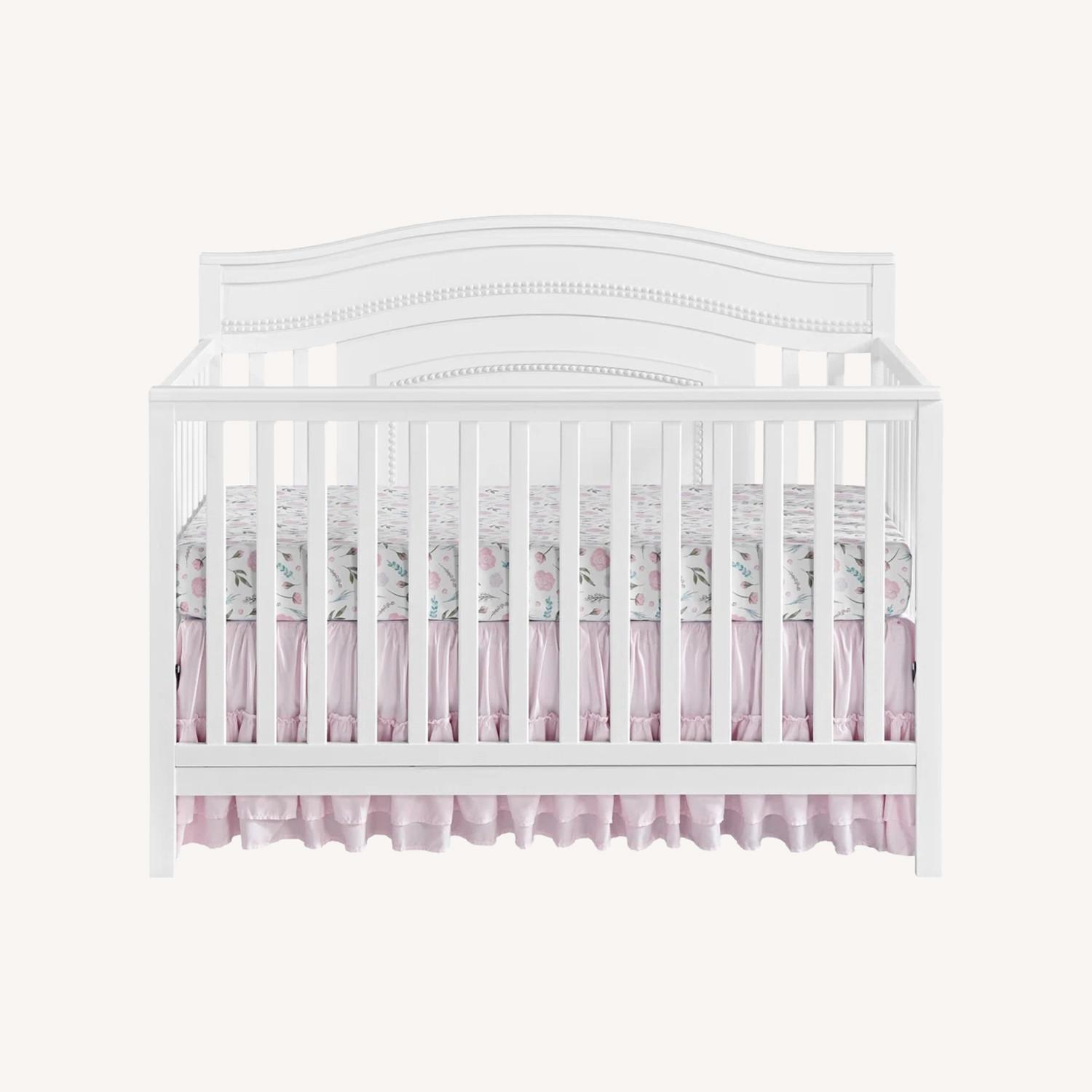 This 4-in-1 convertible crib brings traditional style and a functional design to your little one's nursery. It easily converts from a crib to a toddler bed to a daybed and full-sized bed in seconds to accommodate your ever-growing child. The frame is crafted from solid and engineered wood with a crisp white finish, and the gently curved headboard showcases crown molding, beaded details, and inset paneling for a classic touch. Slatted rails create an open look and feel. Plus, this standard-size crib has an adjustable mattress height that adjusts to three different sizes to hold the mattress of your choice (not included). Conversion rails are not included.