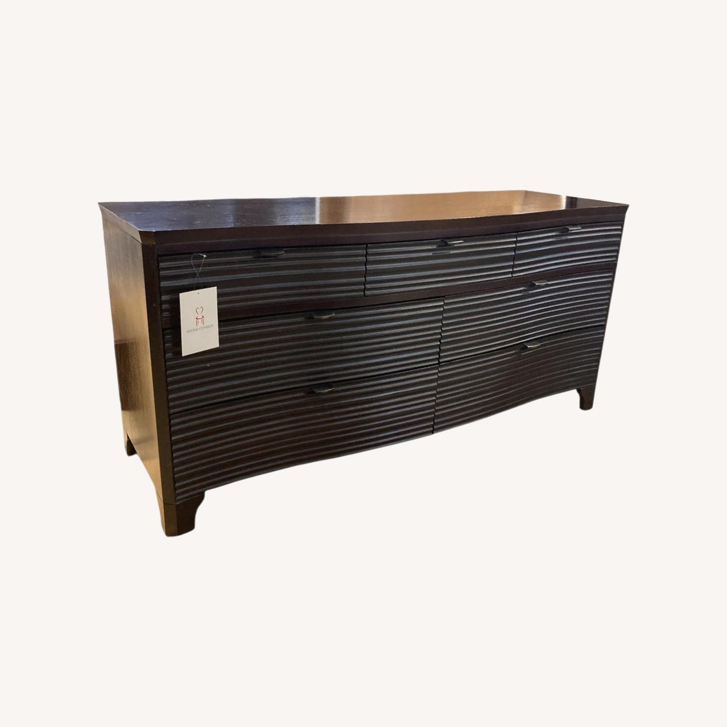 Seller's Notes:The Brownstone 7-Drawer Wave Front Dark Wood Dresser is a striking blend of organic artistry and practical storage, designed to make a bold statement in your bedroom. Its signature wave-front drawer fronts create a sense of fluid movement and visual interest, adding sculptural beauty to a timeless dark wood finish. This dresser elevates everyday functionality with a distinctive design that feels both modern and richly grounded. Featuring seven spacious drawers with smooth-gliding mechanisms, this piece offers abundant storage for clothing, accessories, linens, and more—helping you keep your space organized without sacrificing style. The dark wood finish enhances the natural grain patterns, lending warmth and depth that complements a wide range of décor styles, from contemporary to transitional and luxe rustic. Crafted with attention to detail and quality construction, the Brownstone 7-Drawer Wave Front Dark Wood Dresser is as durable as it is elegant. Whether anchoring a master suite or adding polished storage to a guest room, it’s a standout piece that balances artistic design with everyday practicality.