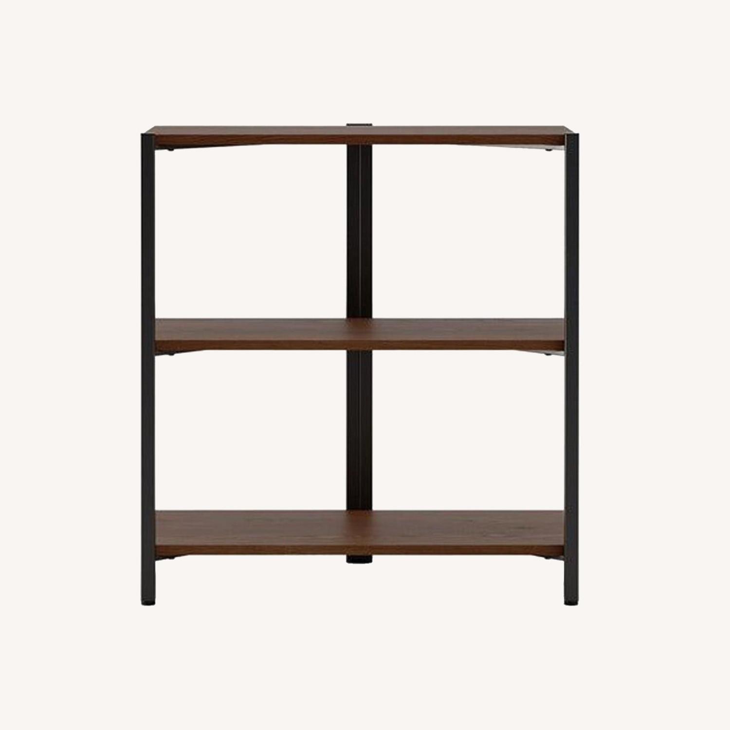 Seller's Notes:This Burrow bookshelf features three spacious shelves with a dark wood finish and sturdy black metal frame. Its simple, modern design fits any room style. Perfect for organizing books, decor, or storage items. Easy to assemble and built to last.