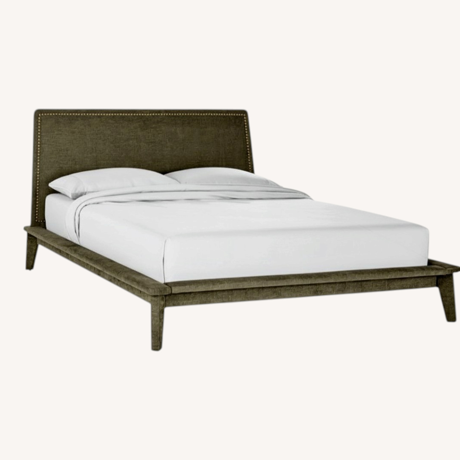 Seller's Notes:Wood frame is wrapped from headboard to legs in dreamy grey upholstery. Antique brass nailheads accent the piece with subtle metallic detail. Designed by Jannis Ellenberger, bed brings the right amount of cozy to any bedroom. Learn more about Jannis Ellenberger on our blog. CB2 exclusive. Designed by Jannis Ellenberger Solid pine, birch and plywood frame 100% polyester in grey Antique brass nailhead detailing To limit fading, avoid direct sunlight Periodic professional upholstery cleaning is recommended